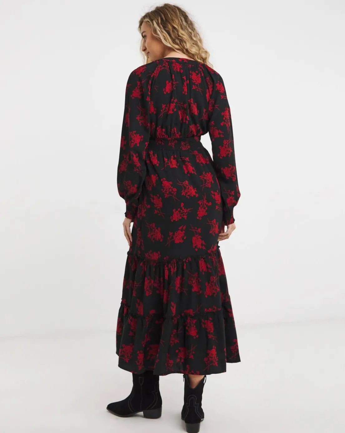 This stunning long sleeve maxi dress radiates regal energy within every detail. From the notch neckline all the way down to the tiered, lined skirt, it is head to toe sophistication. Finished with shirred detail and a rich paisley print, you’ll look second to none floating through winter in this magnificent piece.