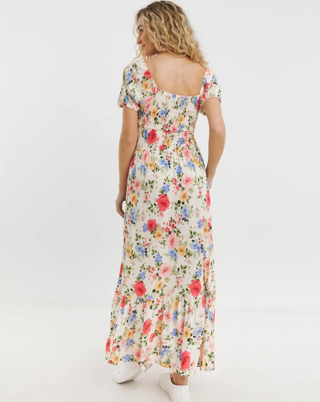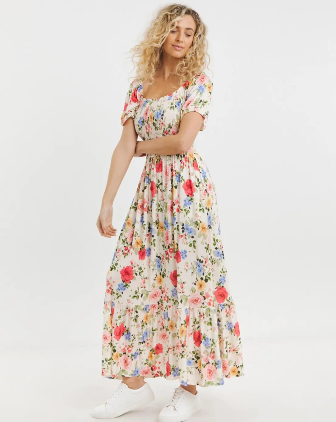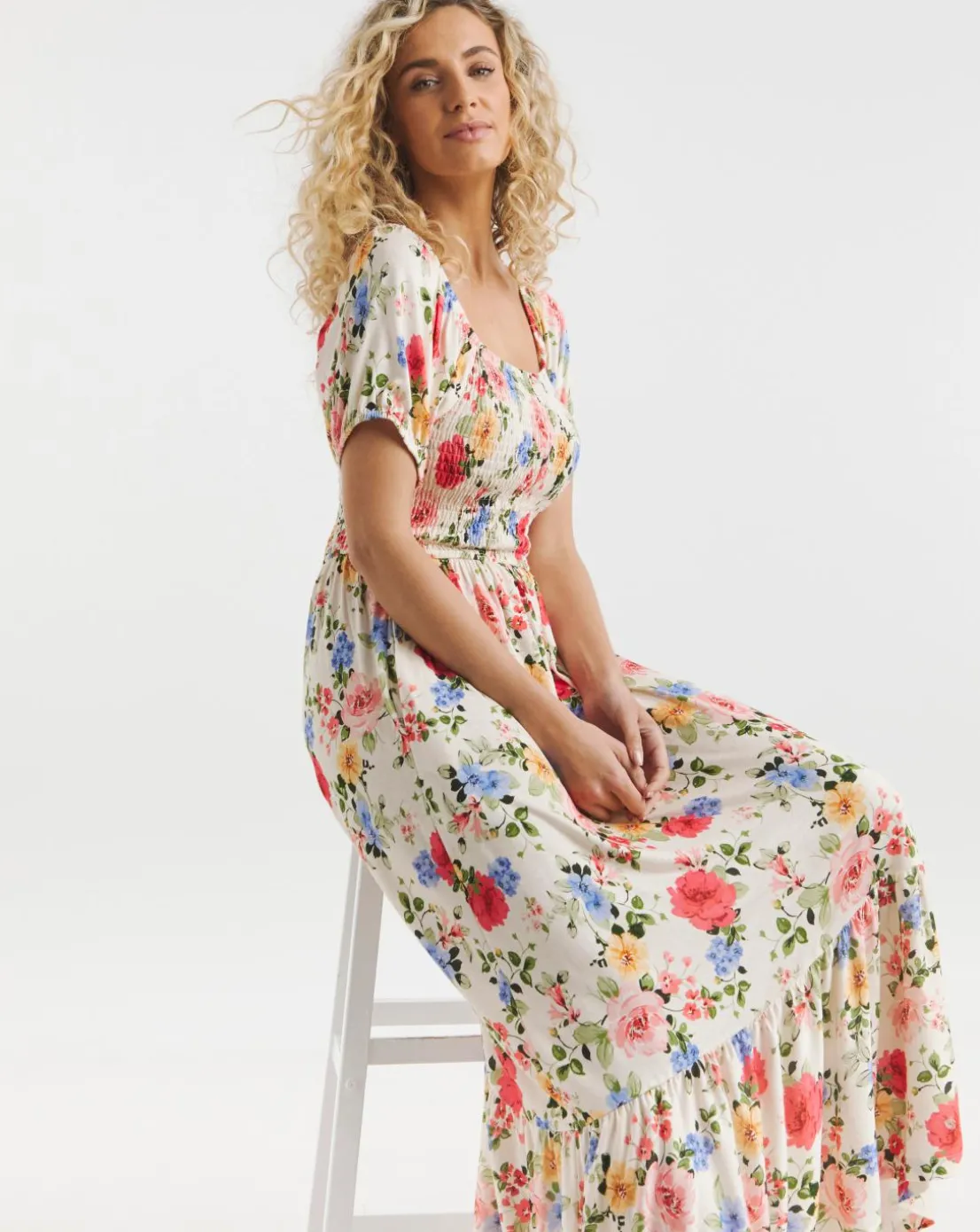 Every spring wardrobe needs the perfect maxi floral dress and this one is about to become your new seasonal favourite. Combining a stunning feminine design with subtle details, we added puff sleeves, a shirred bodice and tiered skirt to bring those all important finishing touches.