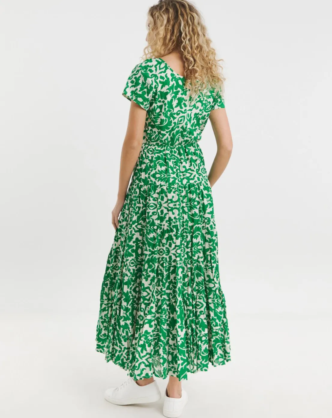 This classic maxi dress is a must-have for the summer. In a beautiful green floral print, throw this dress in your suitcase, give it a shake at your destination and you’re ready to go! With a simple scoop neckline, short sleeves, gently elasticated waist and a full, tiered skirt, just add gold accessories and sandals to make you feel a million dollars on your holiday!