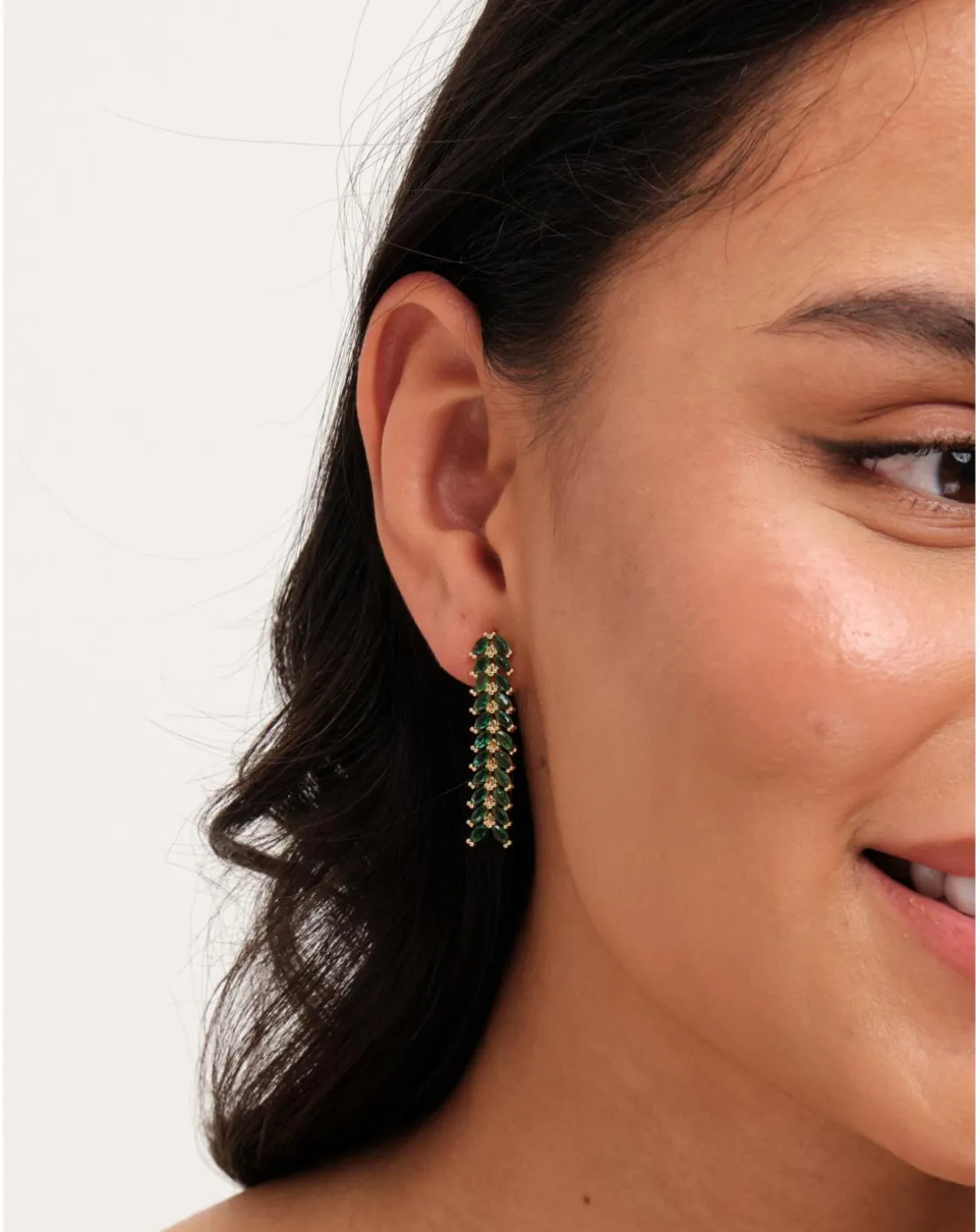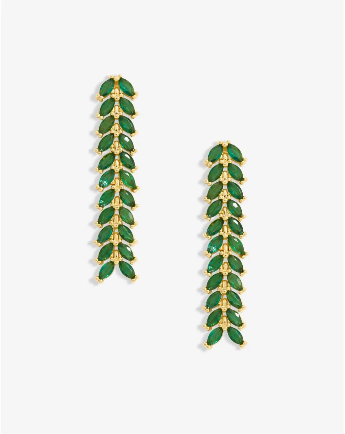 - Our Jon Richard Gold Plated Linear Green Leaf Earrings feature a pretty design with a series of leaf shaped accents in gold plating. These earrings are perfect for adding a touch of elegance to any outfit.