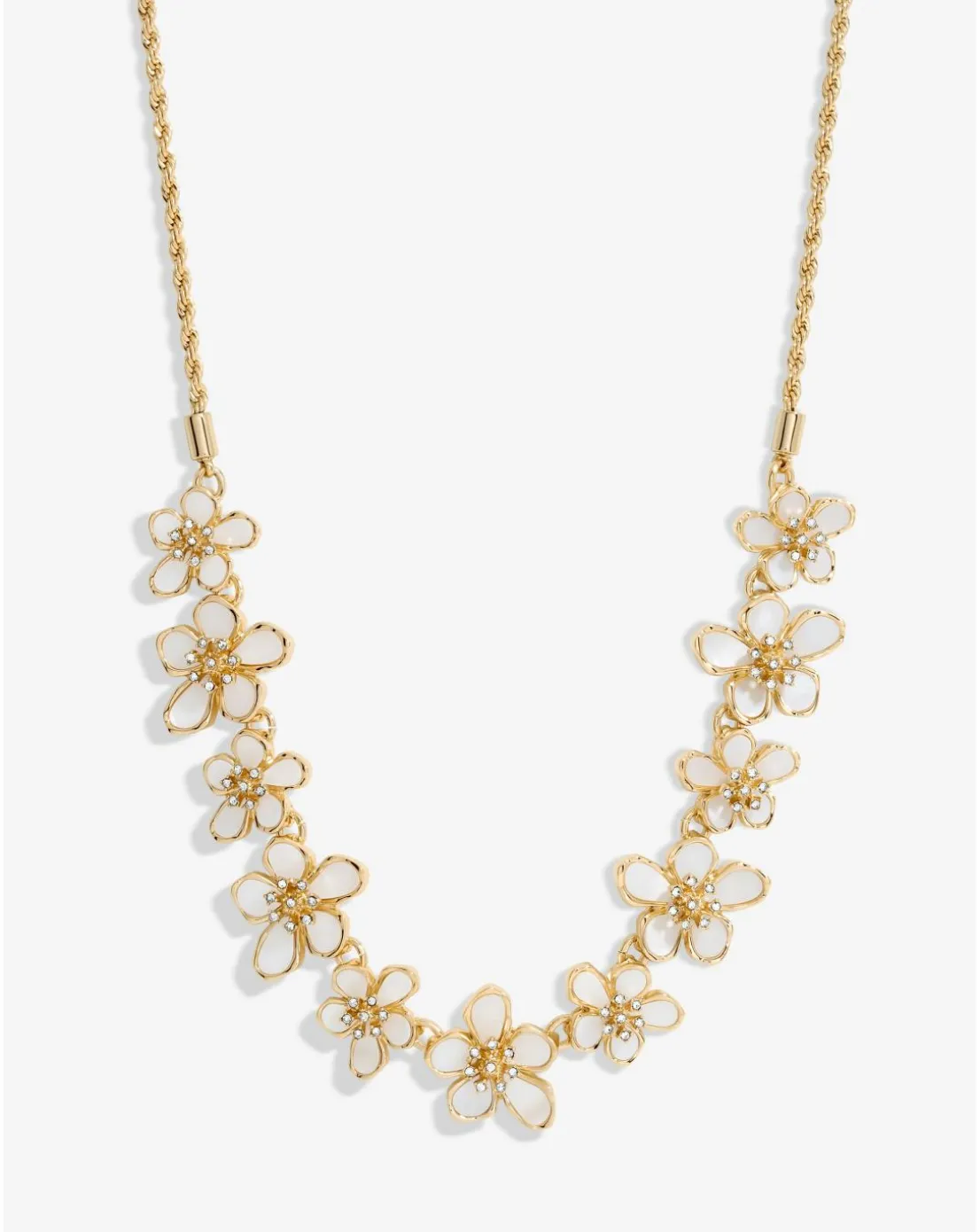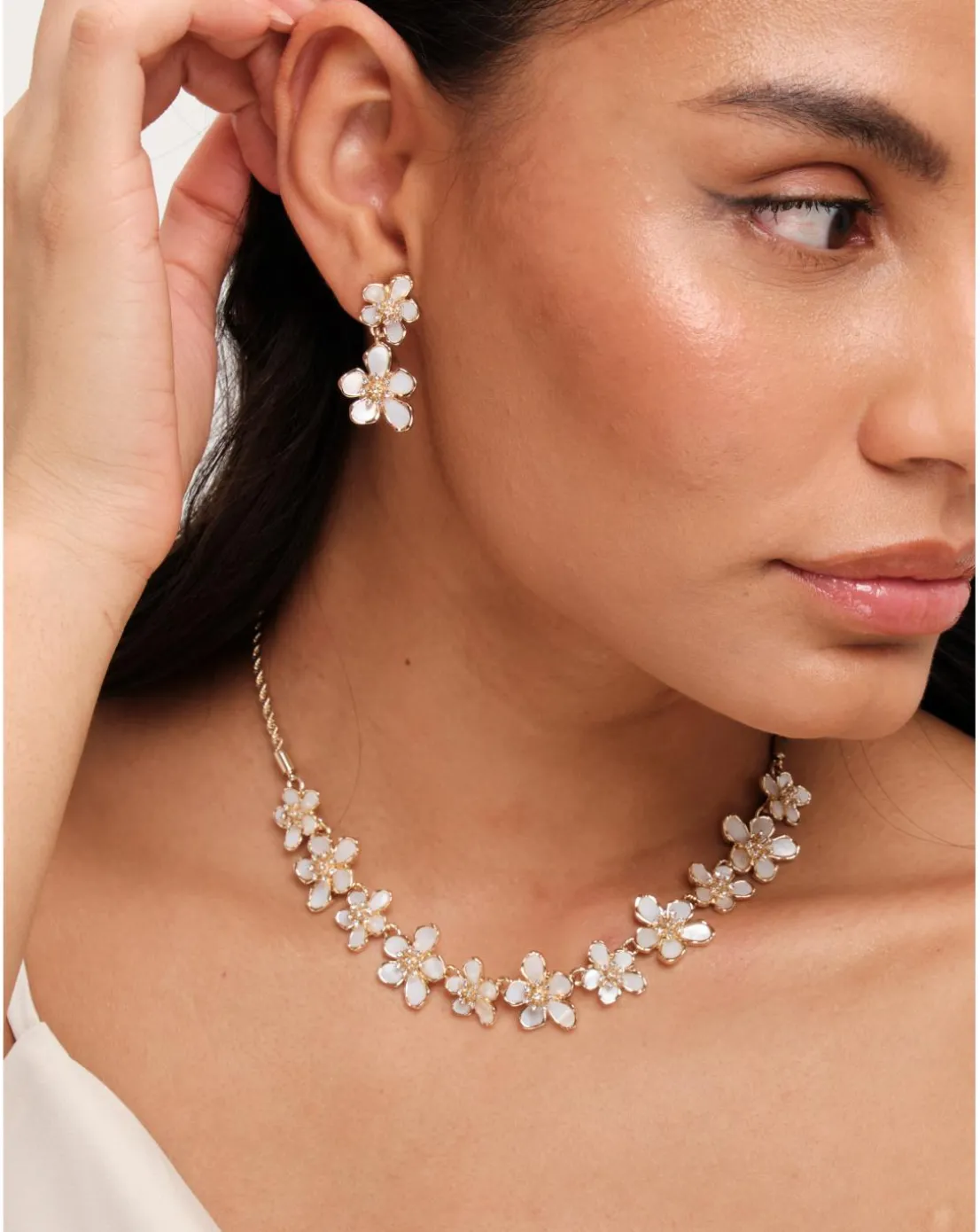 - Our Jon Richard Gold Plated Mother Of Pearl Floral Necklace features a delicate floral design crafted with pretty mother-of-pearl petals, set in gold plating. This elegant piece combines natural beauty with refined craftsmanship, making it an ideal accessory for bridal wear or special occasions, adding a soft, feminine touch.