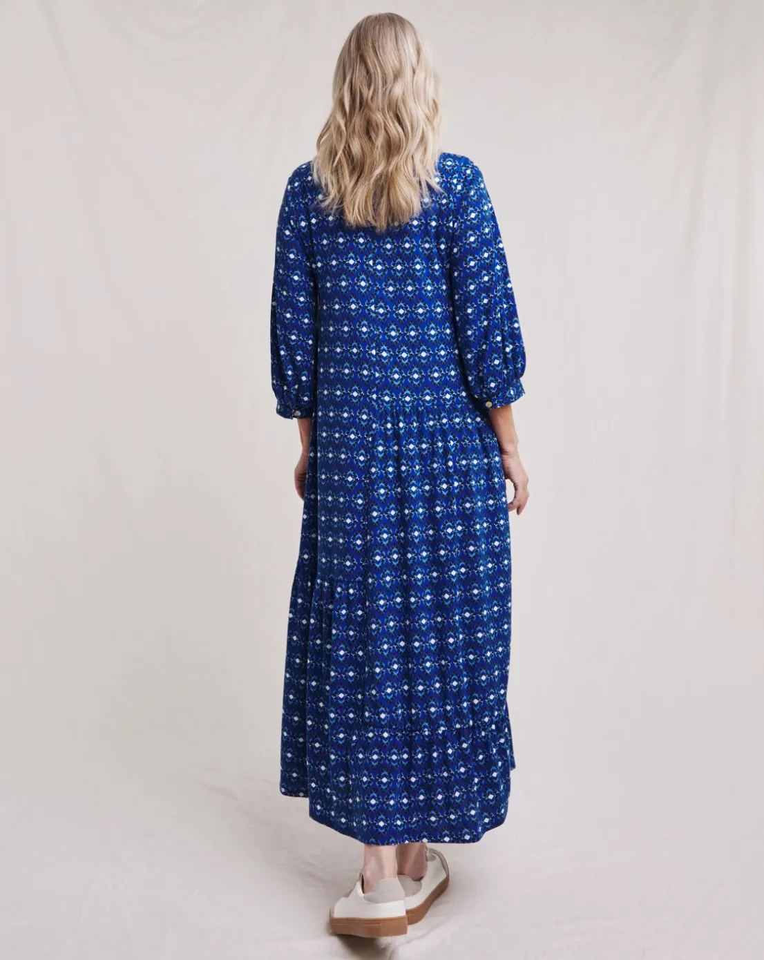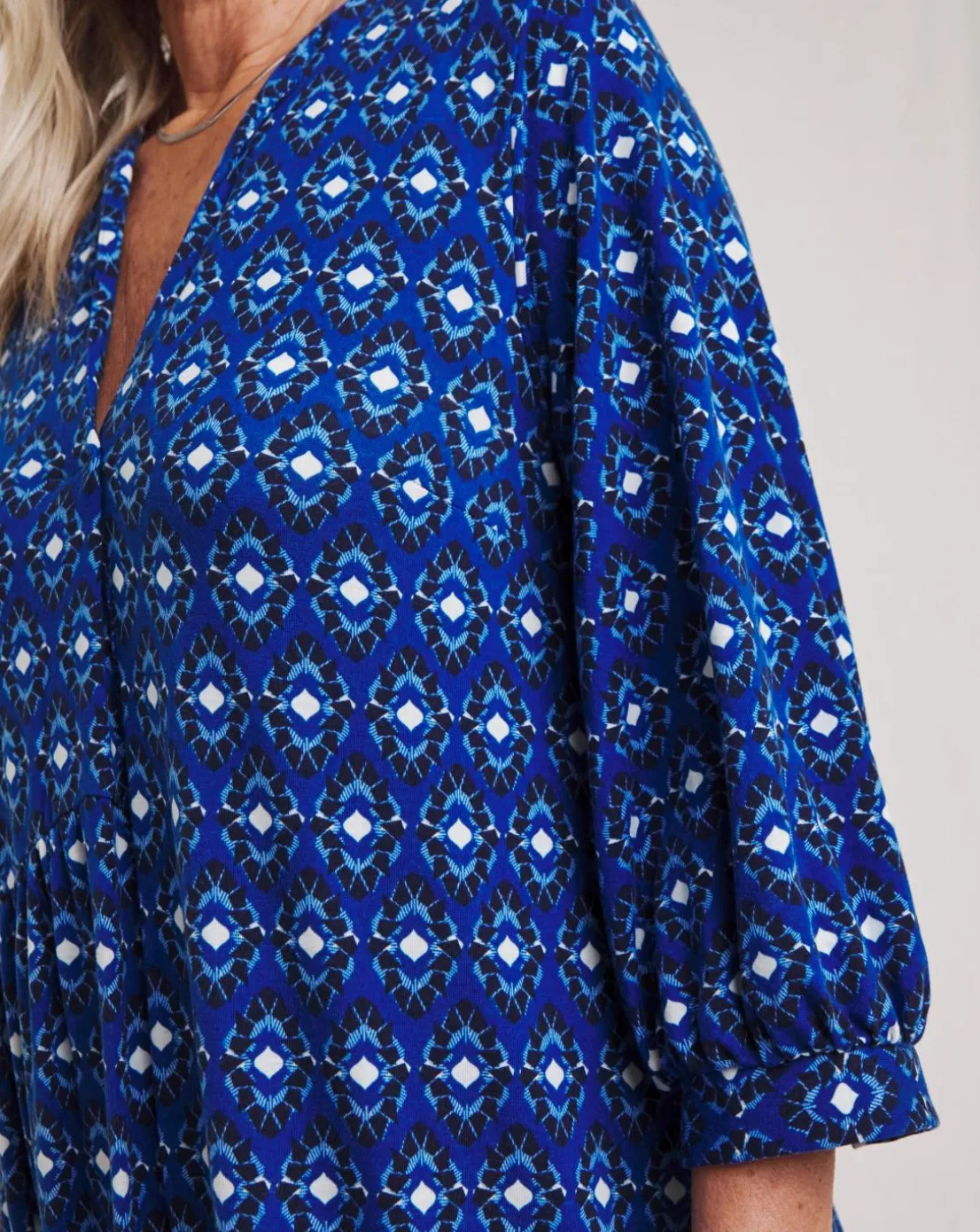 This Julipa Asymmetric Midi Dress is a wardrobe staple. Featuring soft touch jersey fabric, pretty blue print, open v-neck line, flattering midi length, asymmetric seam detail. Style with boots and a jacket for an effortless daytime look.