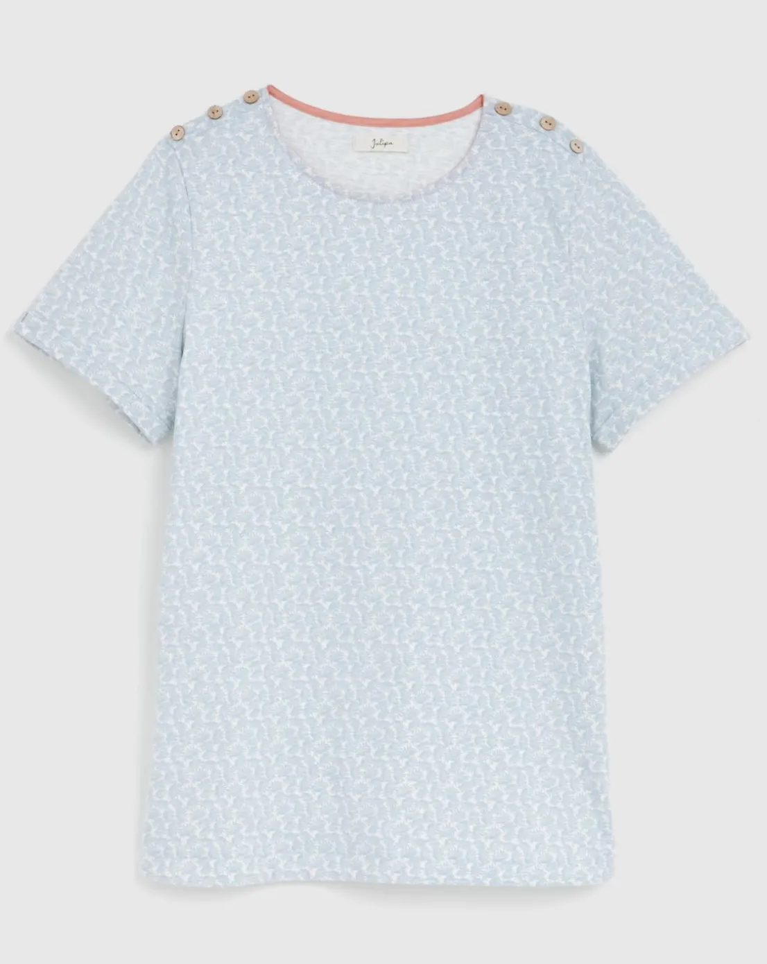 A simple yet stylish printed jersey T-shirt with added shoulder buttons. Featuring a round neck and short sleeves.