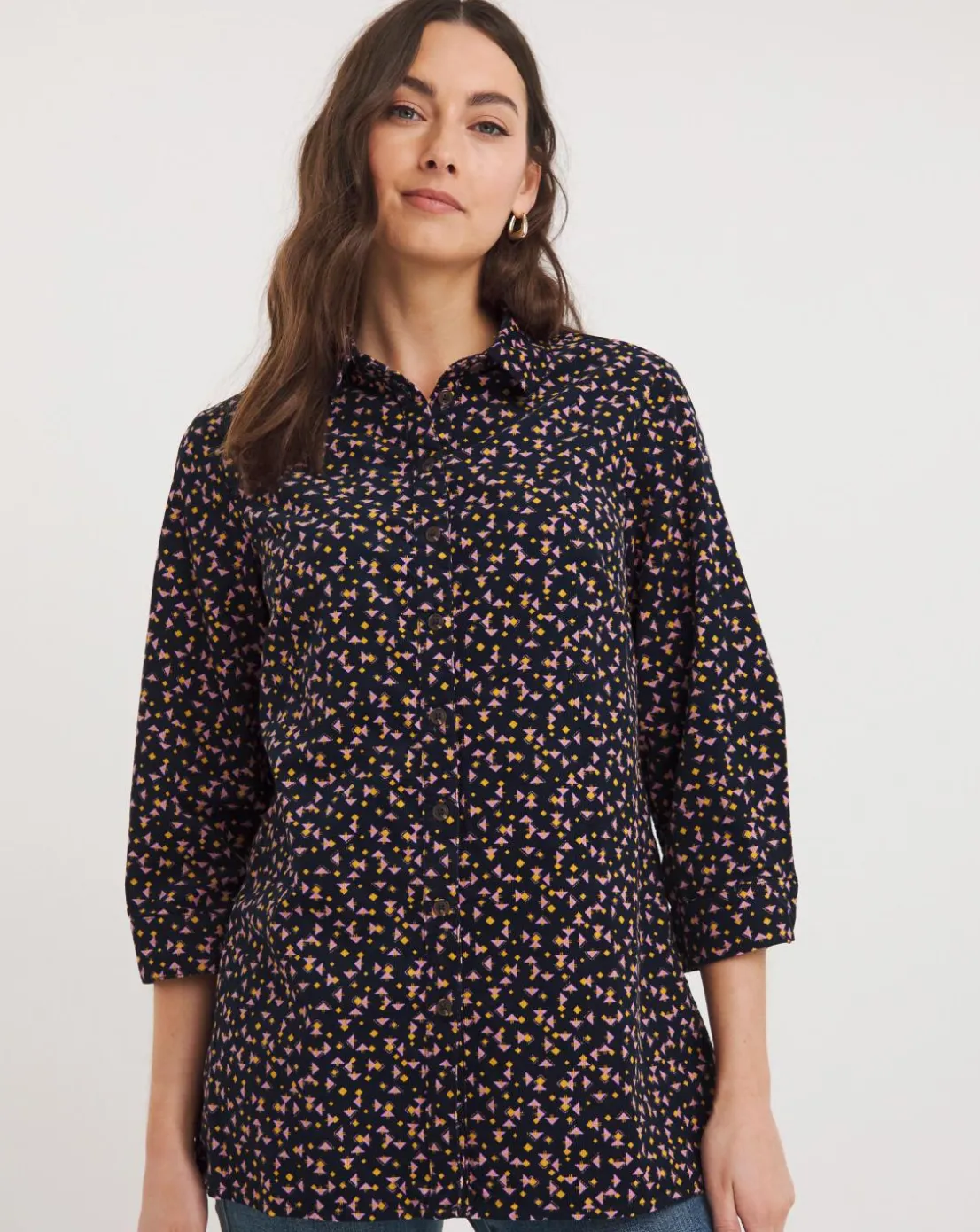 This printed cord shirt is a standout piece. Featuring a button through front and three quarter length sleeves.