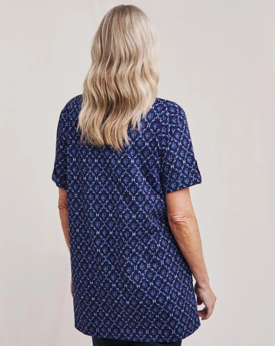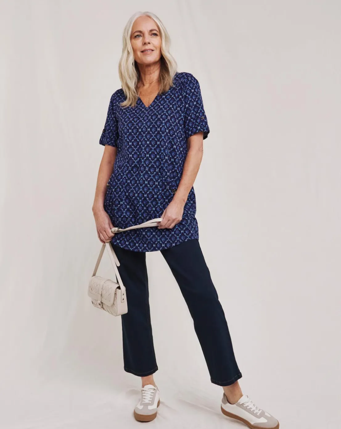 This Julipa Cotton Pocket Tunic is a wardrobe staple. Featuring flattering longline fit, soft jersey cotton slub fabric, pretty navy print, v-neckline, short sleeves. Style with trousers or jeans to complete your casual look.