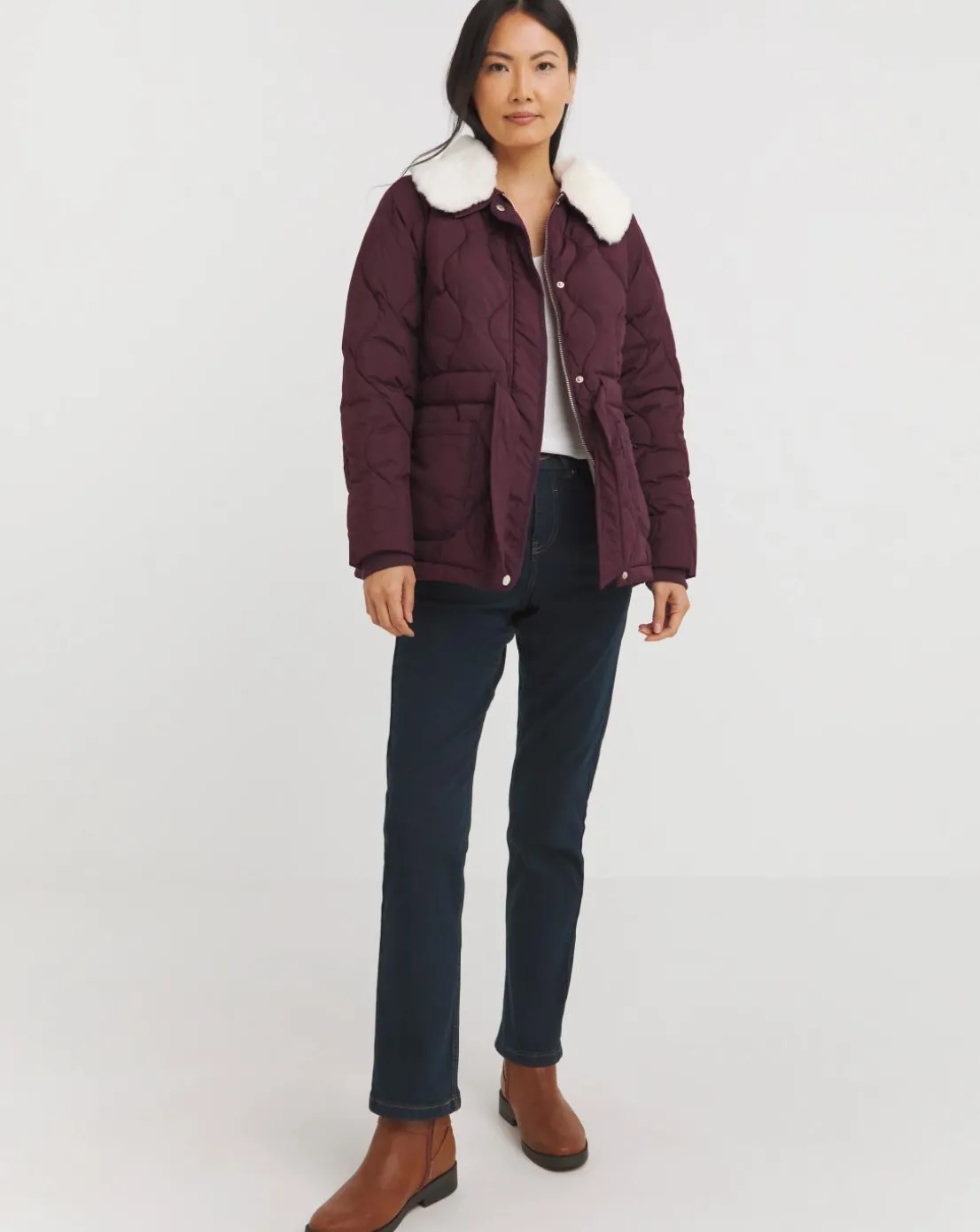 This versatile padded jacket can be worn two ways either with or without its detachable faux fur collar. Designed with comfort in mind the jacket has a self-tie waist channel, ribbed cuffs and a faux fur lining on the inside. Designed with an onion quilt and patch front pockets.