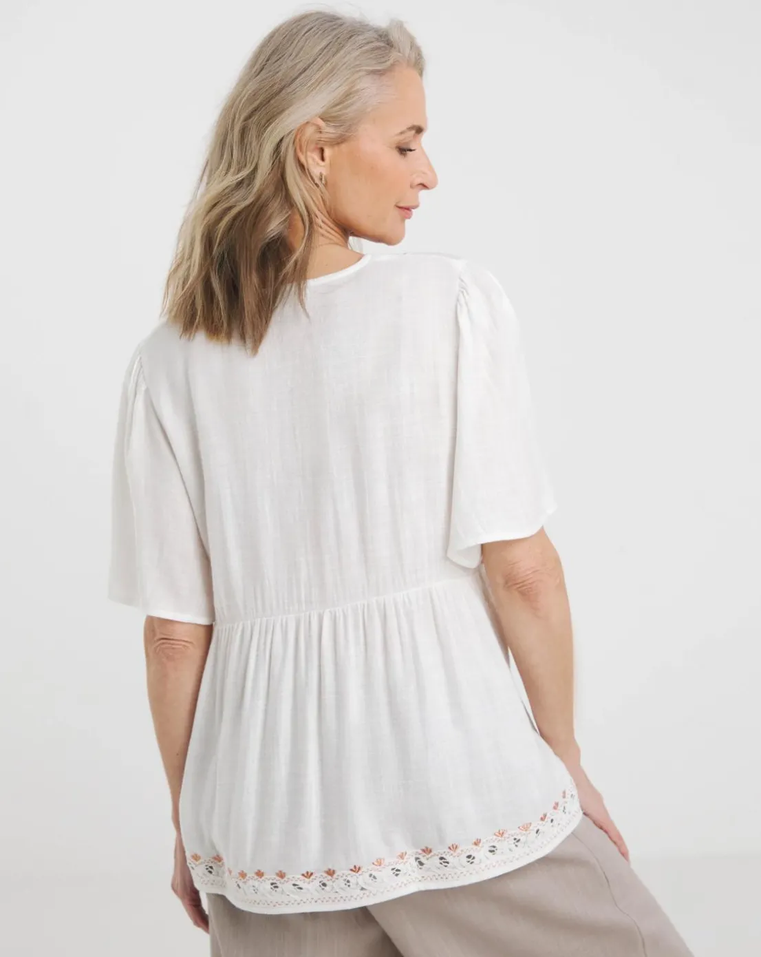 This cotton blouse features a feminine embrodery design on a V-neckline. The short sleeves and loose fit of this blouse creates a flattering shape for the summer.