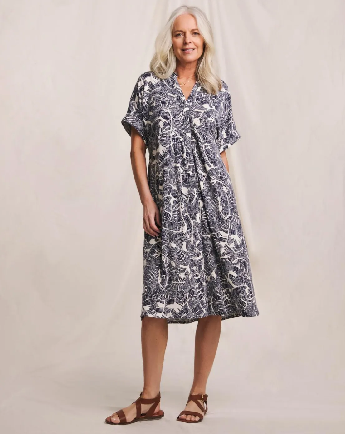 Shop this easy daytime piece, our soft jersey cocoon shift dress is a staple for your summer wardrobe. Featuring flattering cocoon shift style shape, shirt collar v-neckline, pretty leaf print, turn up sleeves, and super soft jersey fabric.