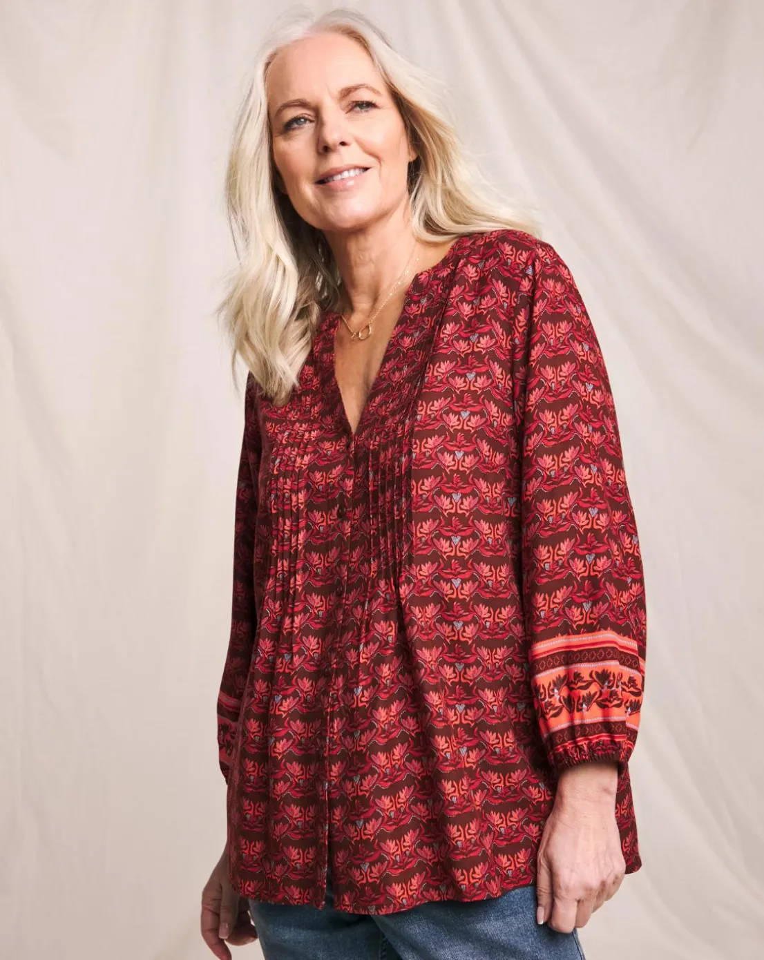 Your favourite pintuck blouse in a lovely new season print. Featuring soft woven fabric, gorgeous print with border design to the sleeves, notch neckline, regular fit.