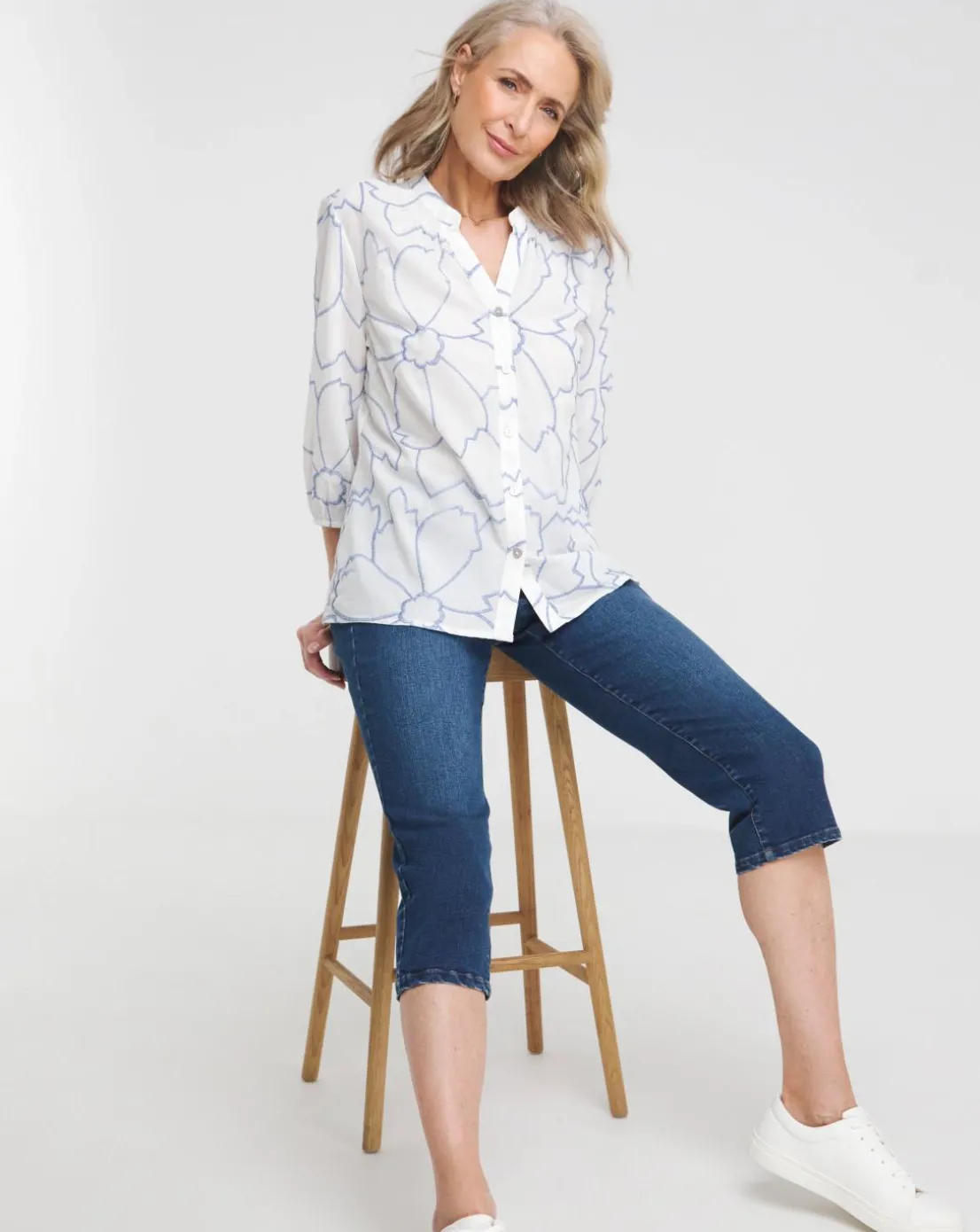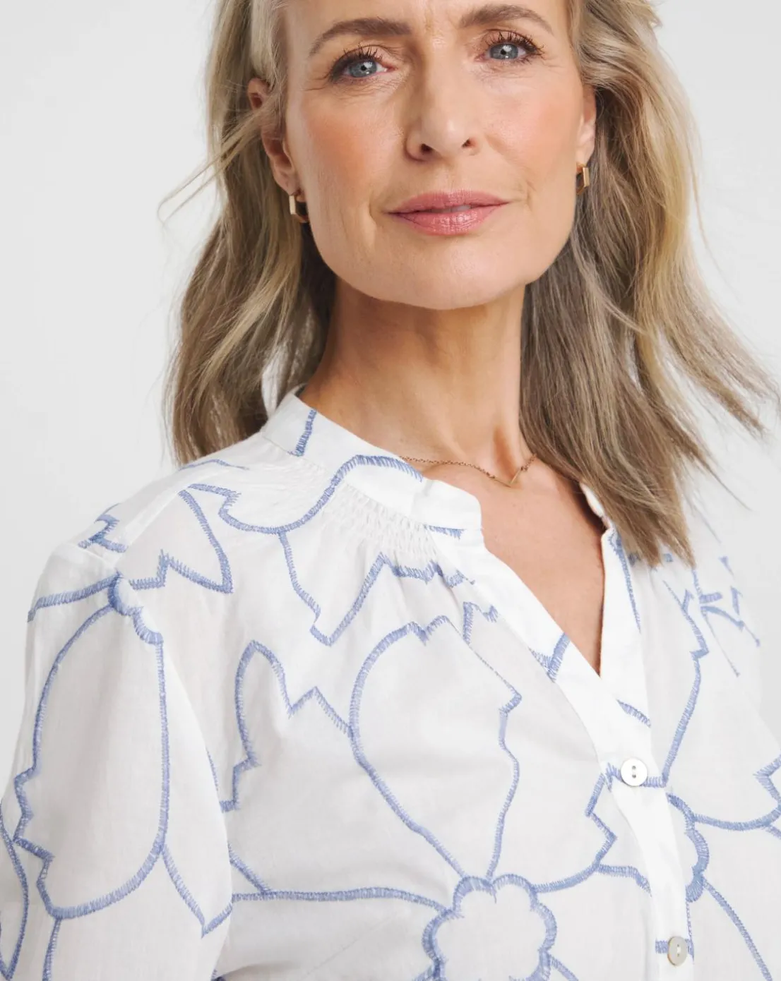 Perfect for the days when you need something smart-ish. This collarless button down blouse is relaxed and full of detail, designed in a breathable cotton fabric with contrast embroidery.