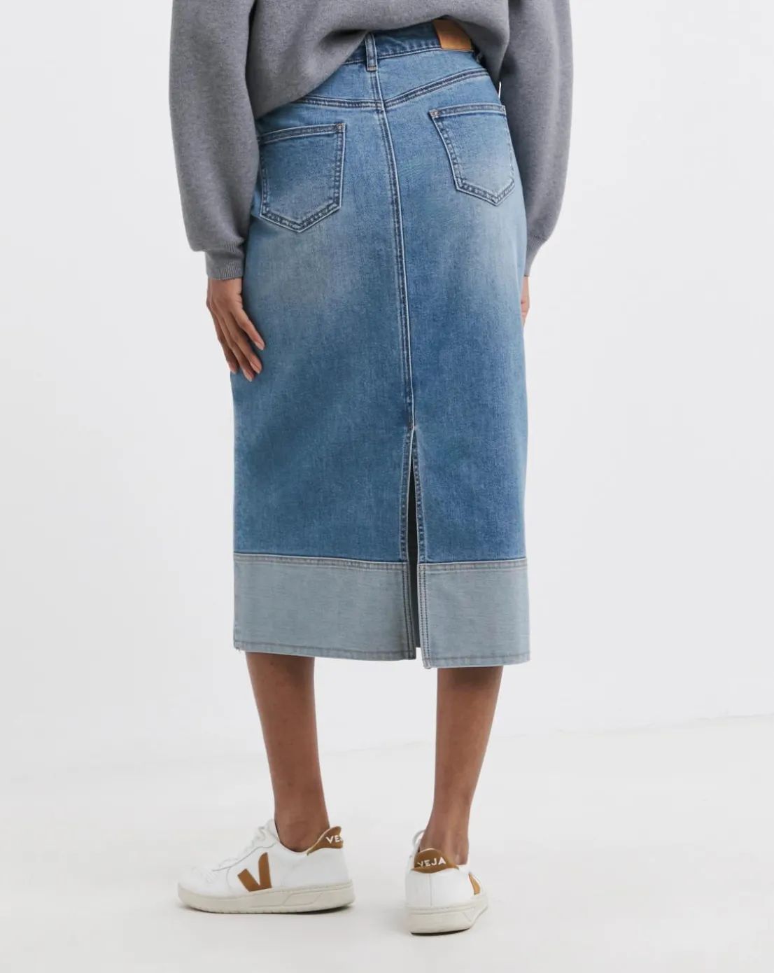 Shop our new colourway on the turn up midi skirt, designed in our comfort stretch denim. Featuring turn up hem detailing, classic jean pocketing and belt loops. Pair with knee boots for an effortlessly chic outfit.