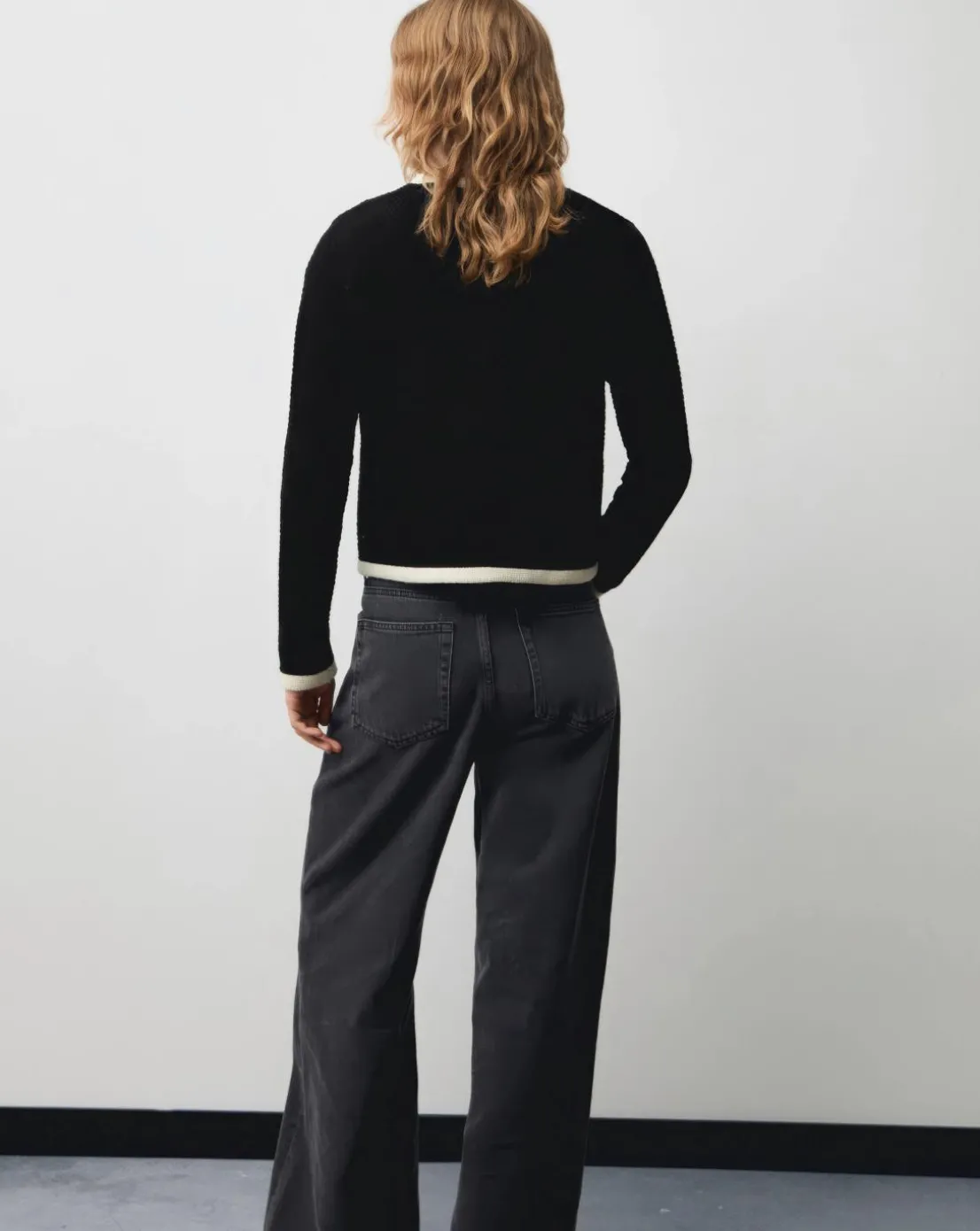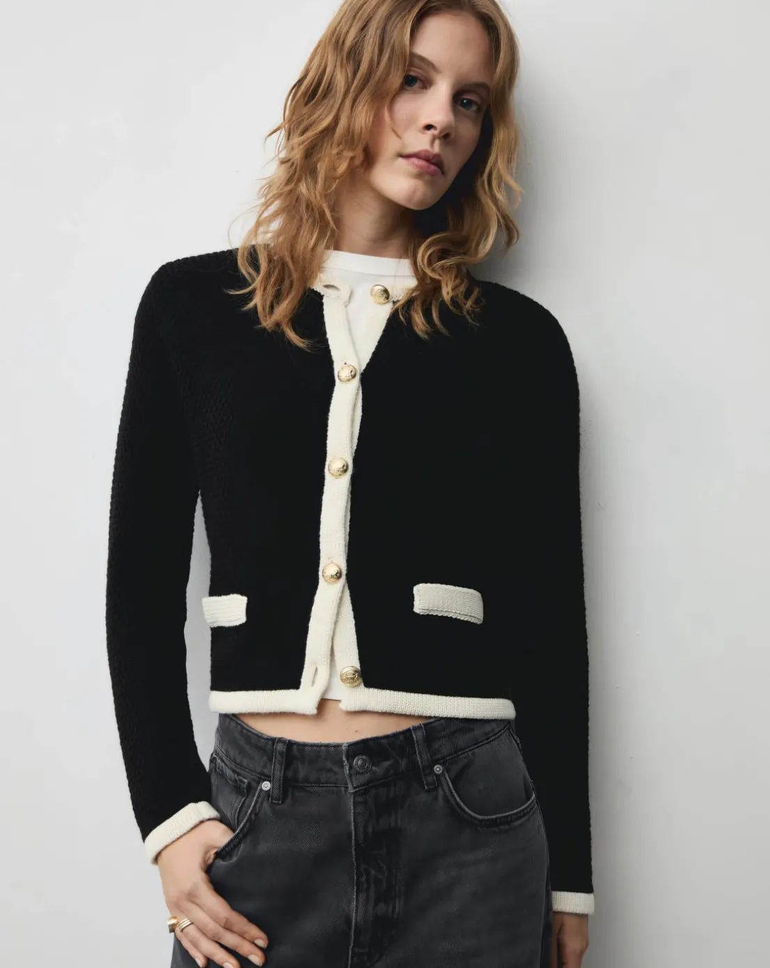 Knitted fabric. Medium knit. Straight design. Round neck. Long sleeve. Two patch pockets on the front. Front closure with buttons. Contrasting trims. Office looks.