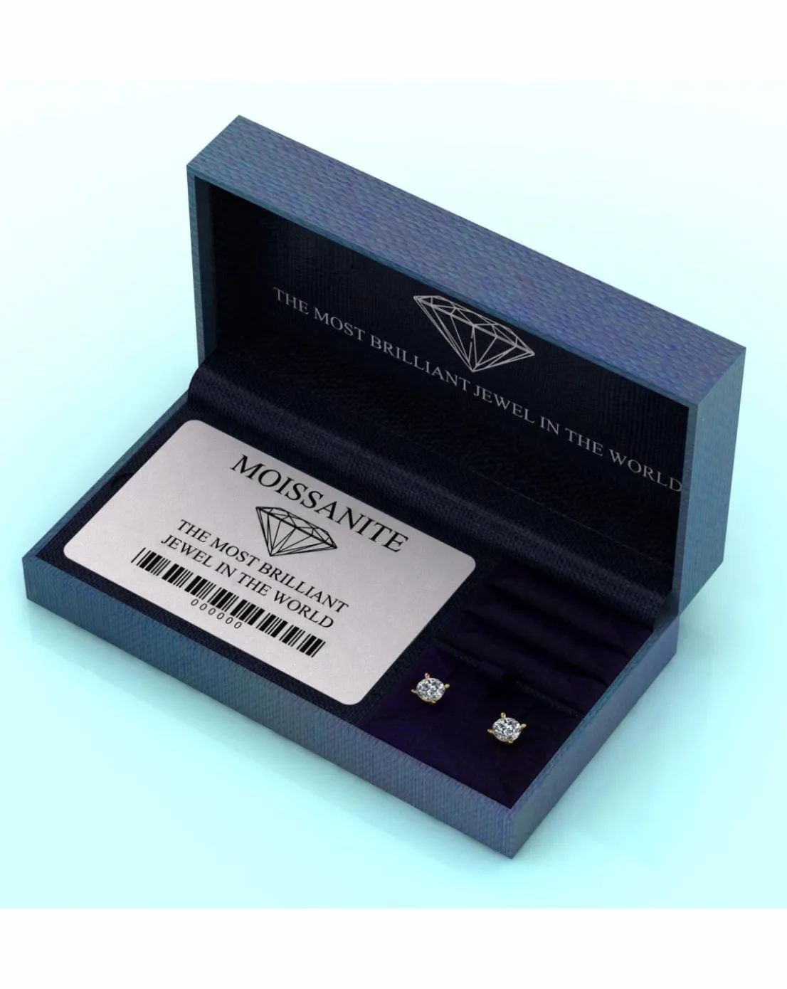 - Features two 6.5mm round brilliant Moissanite hand set into a 4 claw setting with 9ct yellow gold pins and scrolls. The integrated sparkle will simply take your breath away