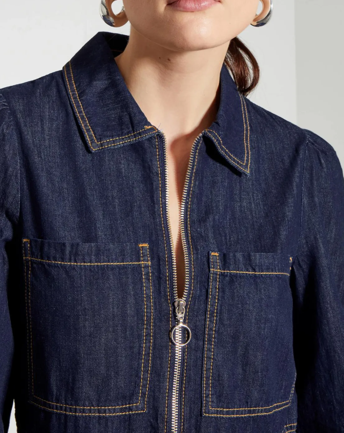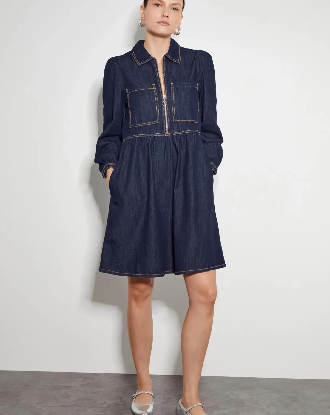 - Style: it’s in the jeans. A piece you can slip on for every type of occasion, this denim dress is designed with a collar, long sleeves and mini-length hem. Finished with a front zip detail and patch pockets to the chest.