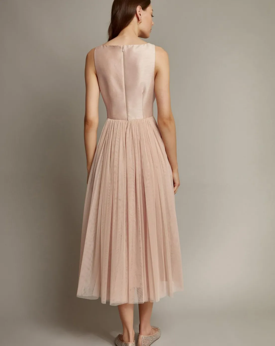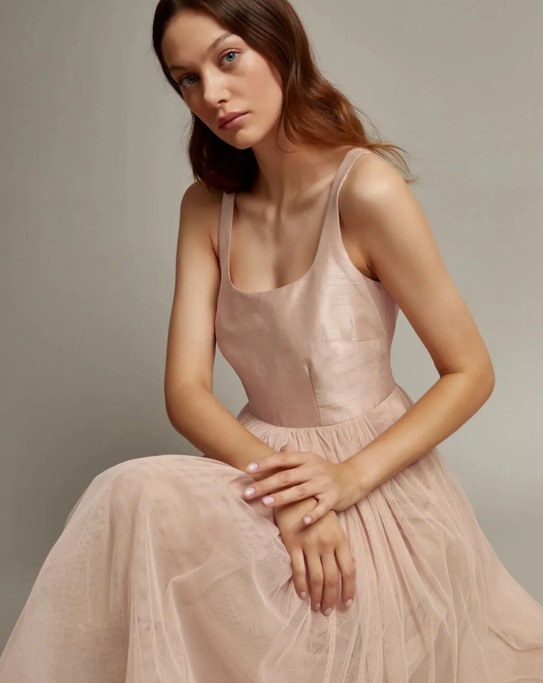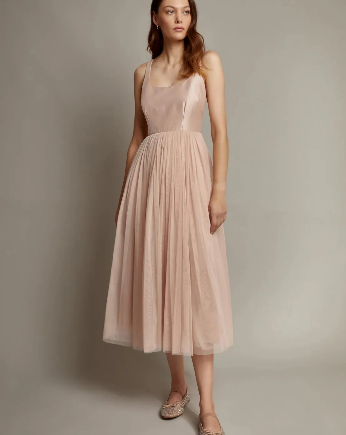 - Occasionwear en pointe. Imbued with ballerina-esque elegance, this dress is designed with a sleeveless square neck bodice, finished layers of tulle to create a slightly voluminous midi-length skirt.