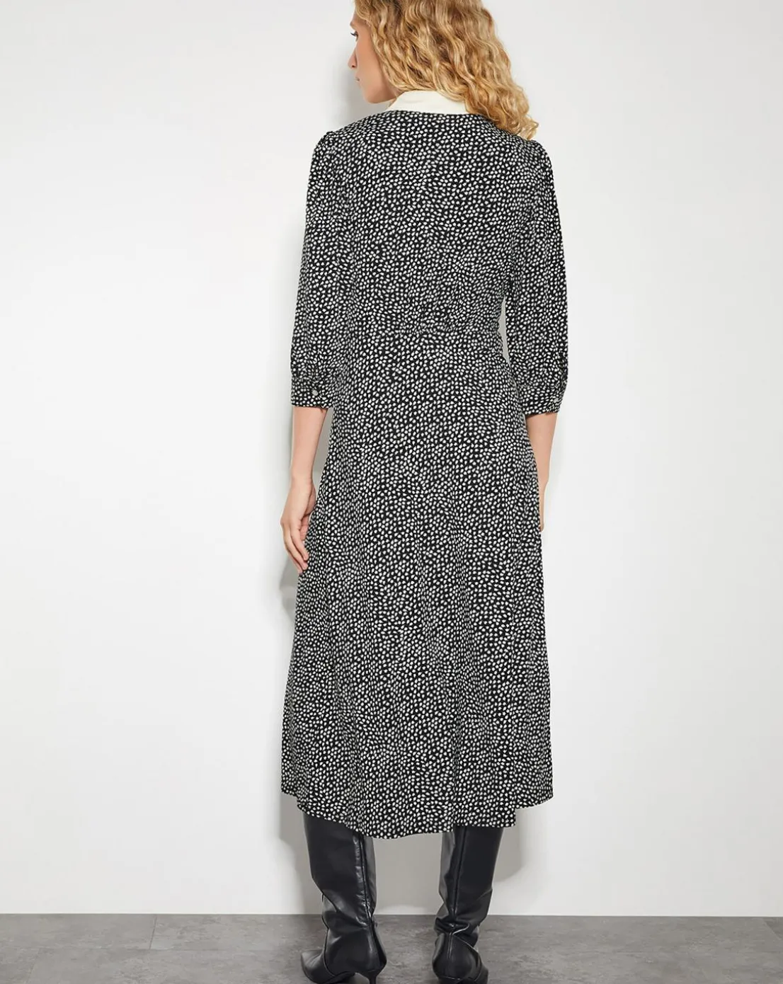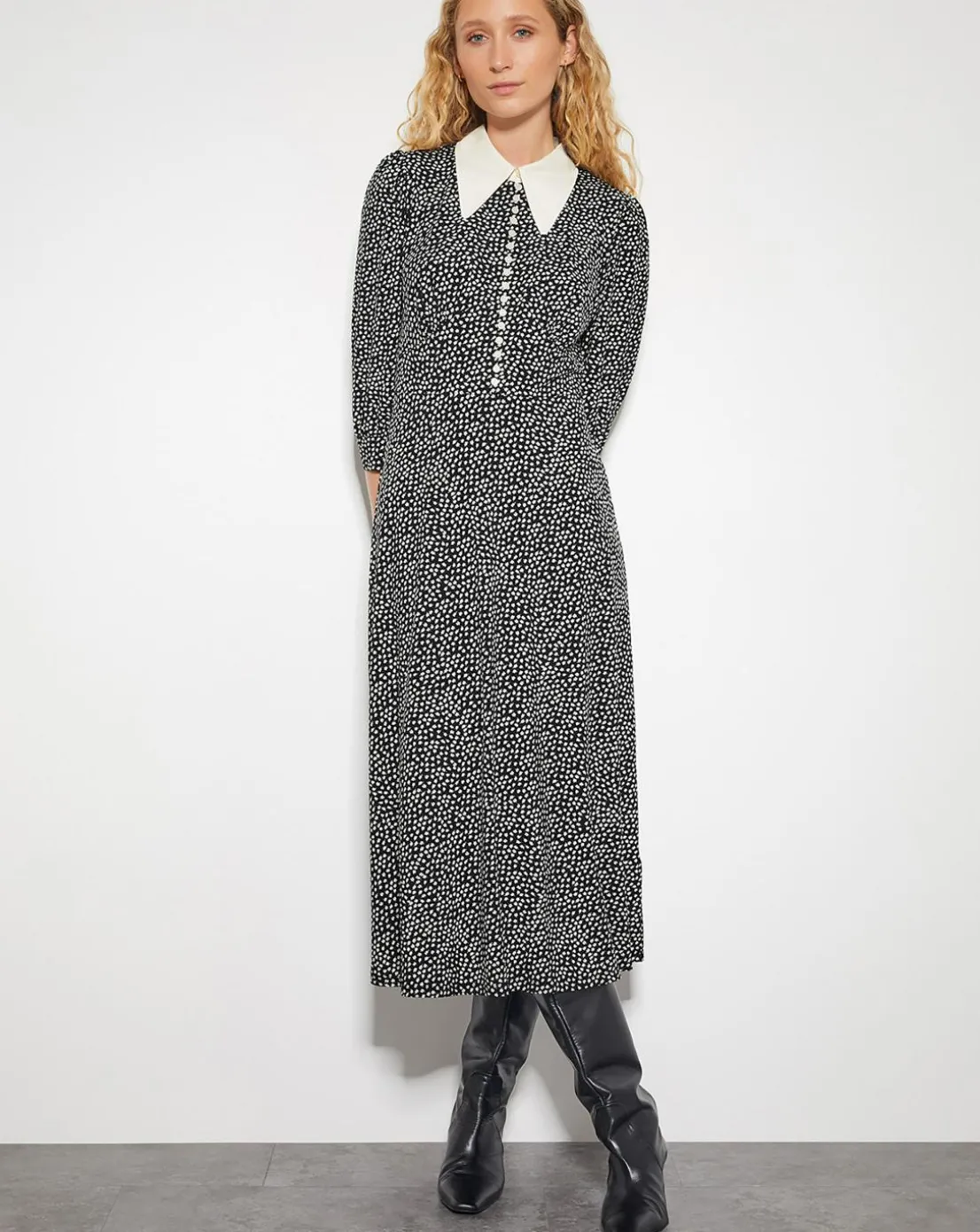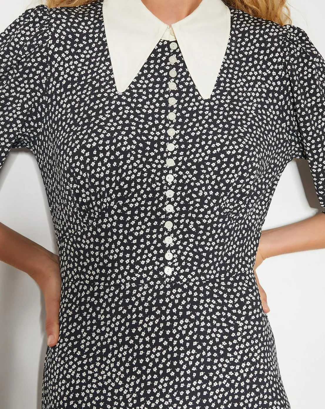- Your 9-5, upgraded. Designed with a statement point collar, button detailing through the front, and a ditsy floral print, this midi-length dress boasts a shirt-style bodice and A-line skirt.