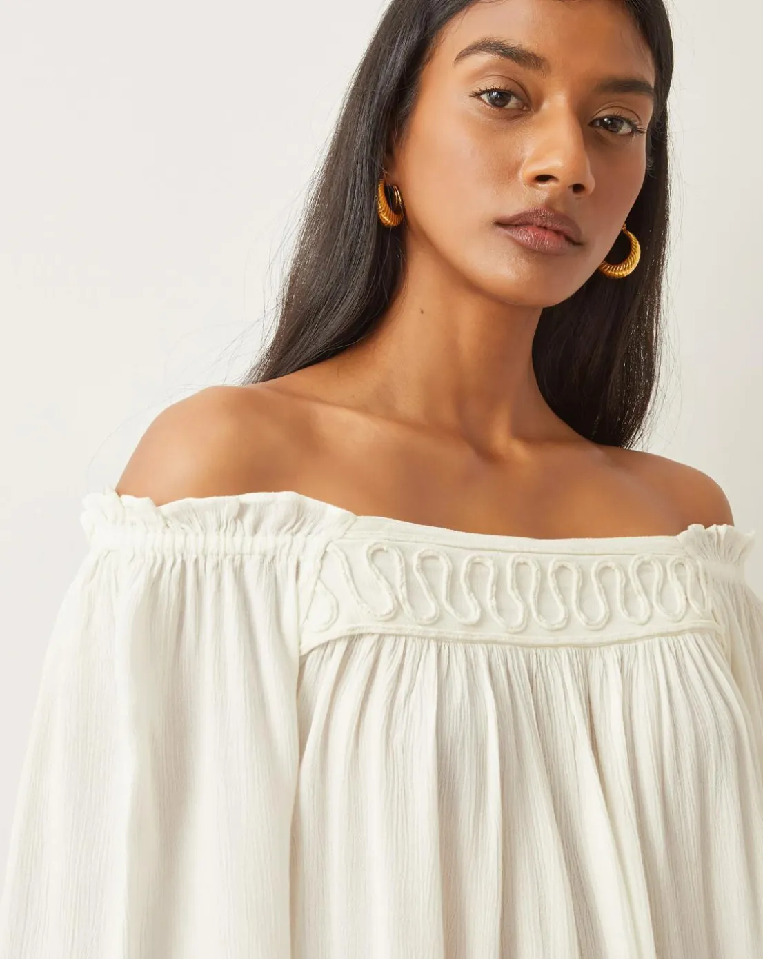 - (Brigitte) Bardot with a boho twist. The perfect top for showing off sun-kissed shoulders, it’s designed with an off-the-shoulder neckline, billowy sleeves and frilly finishes. Decorated with intricate braided embroidery at the front.