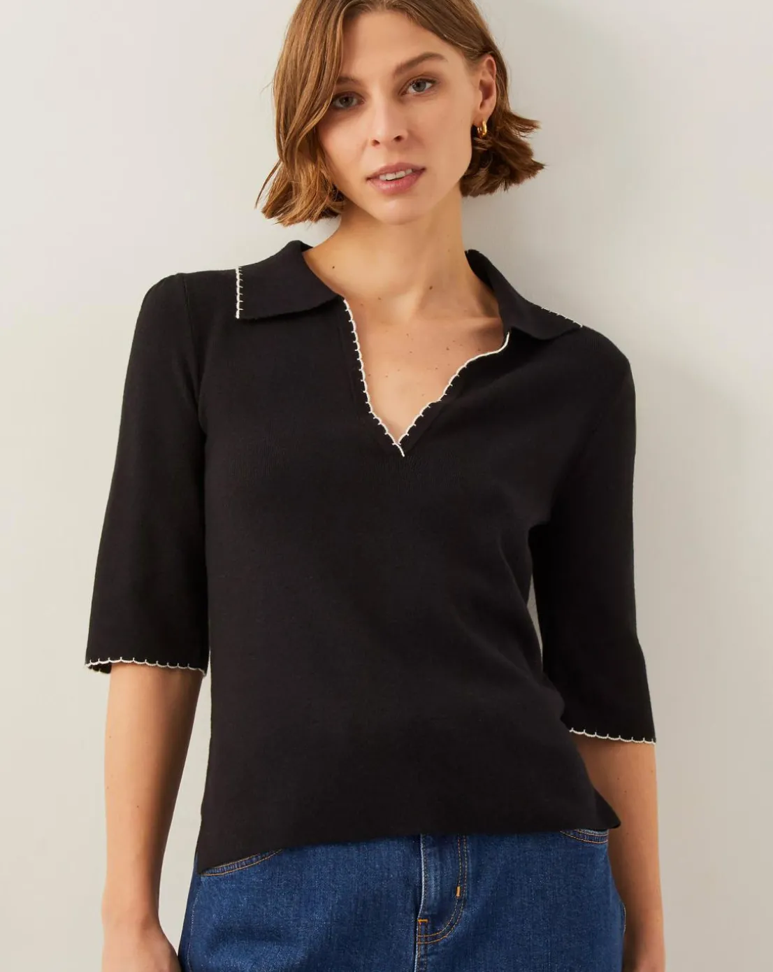 - Smart choice. A pretty, polished addition to your knitwear collection, this jumper is framed with a collared neckline, V-front and short sleeves. The best thing? The contrasting hems have a scalloped finish. So cute.