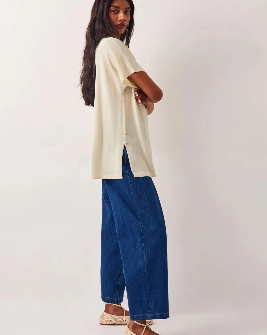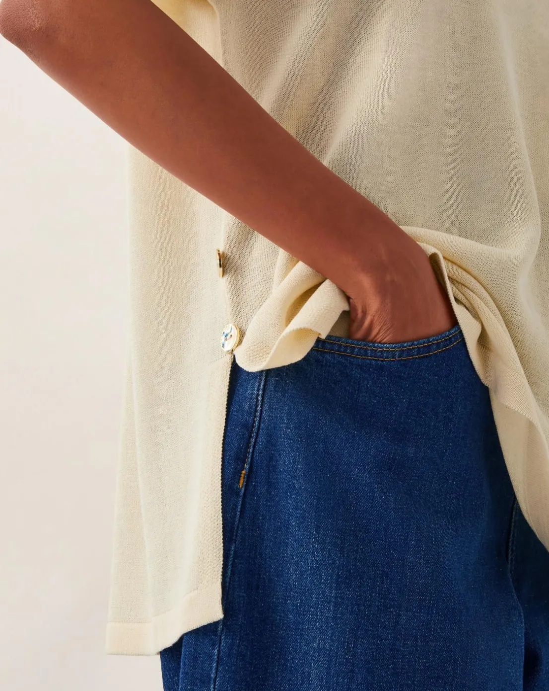- Keep it simple. Slouchy yet smart, this knitted number is a sheer delight for your transitional wardrobe. Designed with a collared neckline, V-front, short sleeves and side slits with gold button details to finish.