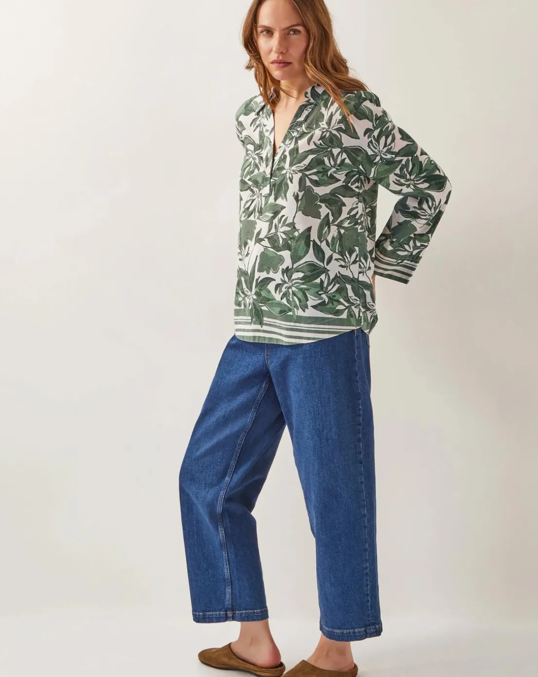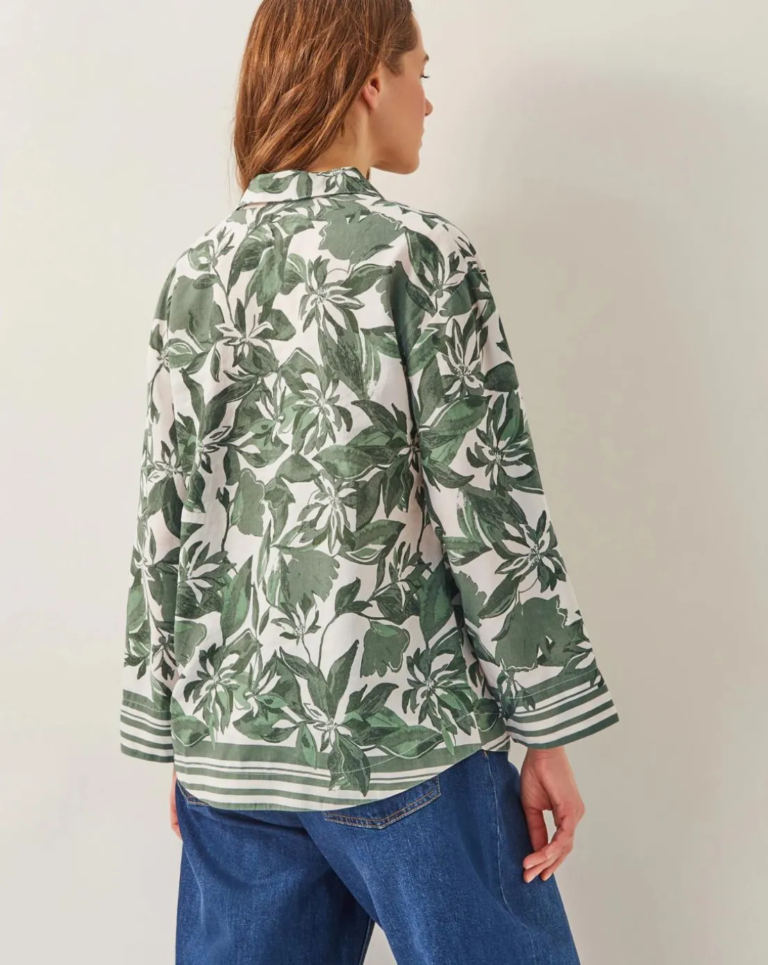 - Another floral blouse? Oh, go on then. Whisked from a lightweight viscose and linen blend, this blouse features a sharp collar, open front and full length sleeves, all cloaked in a decorative green floral pattern.