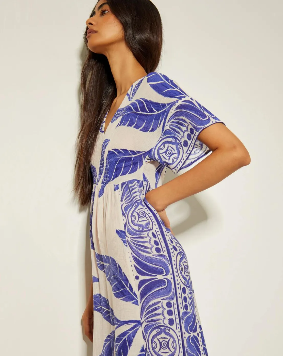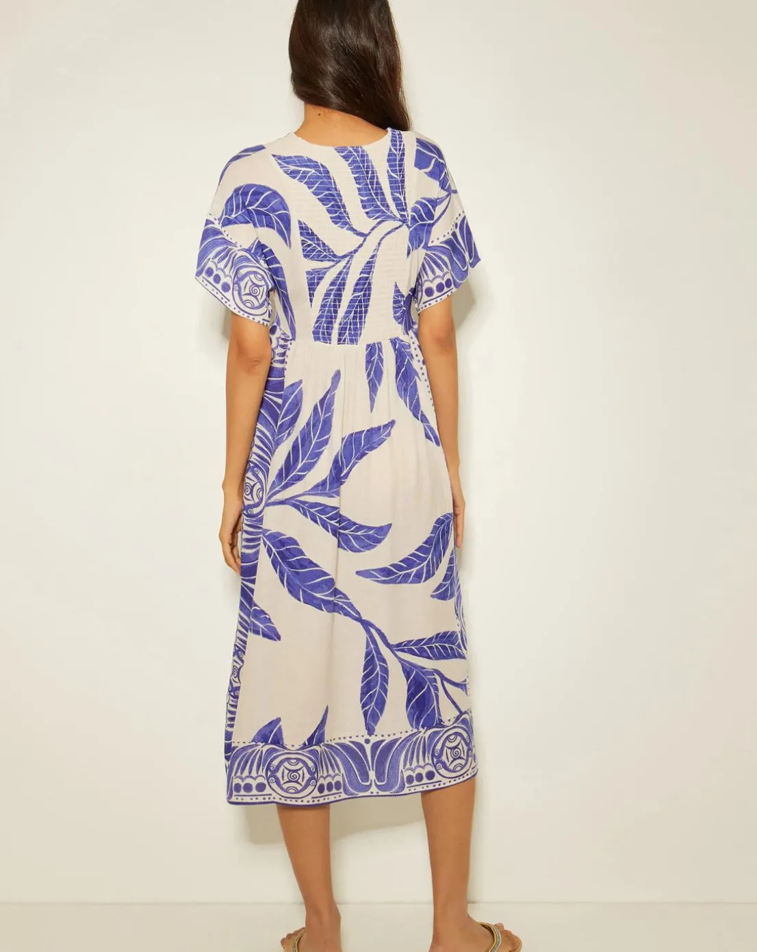 - Made for somewhere sunny. Framed with ornamental patterns and bold palm leaf prints, this midi dress is a must-have for your suitcase. Designed with a V-neckline, short sleeves and a midi-length hem, it works for both day and evening wear. Looks best with a pair of statement sunnies.