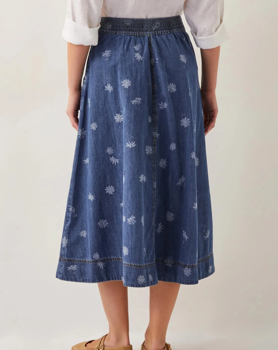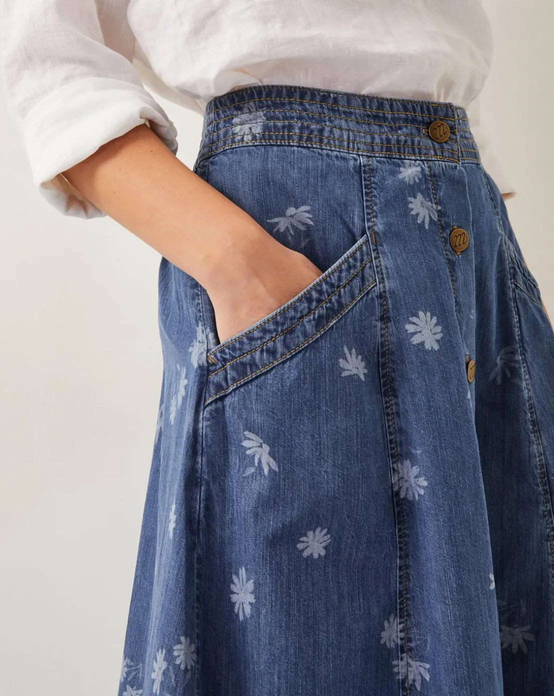 - Denim that blooms. Slung high on the waist with a swishy A-line silhouette, this denim skirt is a timeless staple that pairs perfectly with everything in your wardrobe. Finished with a button fastening through the front and an all-over daisy print.