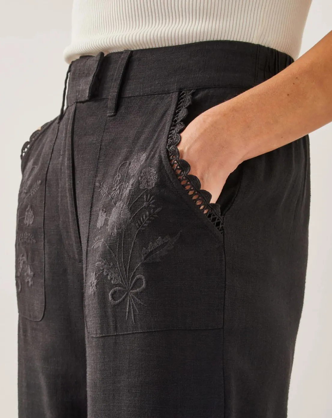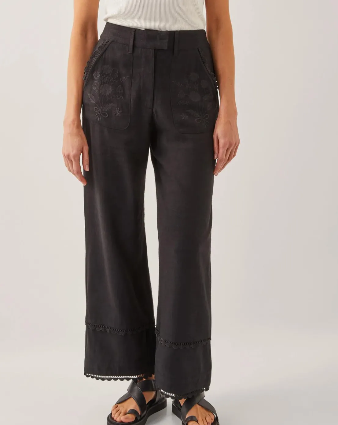- Easy elegance, stitched to perfection. These embroidered black trousers blend breezy comfort with intricate detail. Featuring delicate floral embroidery and airy cutwork, they’re effortlessly chic. Make it a match and style these trousers with the matching Hayley Embroidered Tie Top.