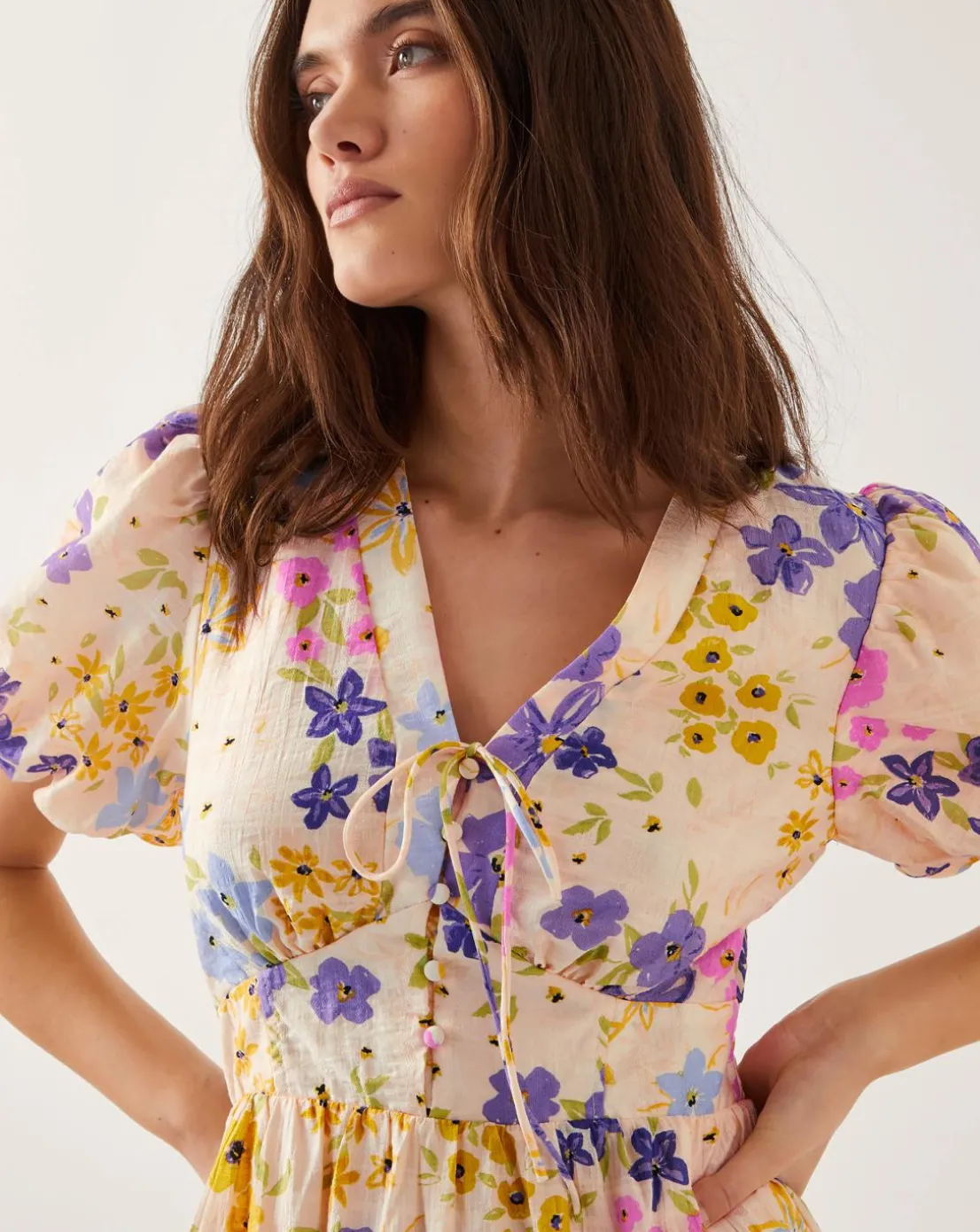 - In full bloom. Strut into wedding season in this dress, doused in colourful painterly florals over the tea silhouette. Featuring a cinched waist and button-through neckline, the puff sleeves and midi dress will dance with you as you take on the dancefloor.