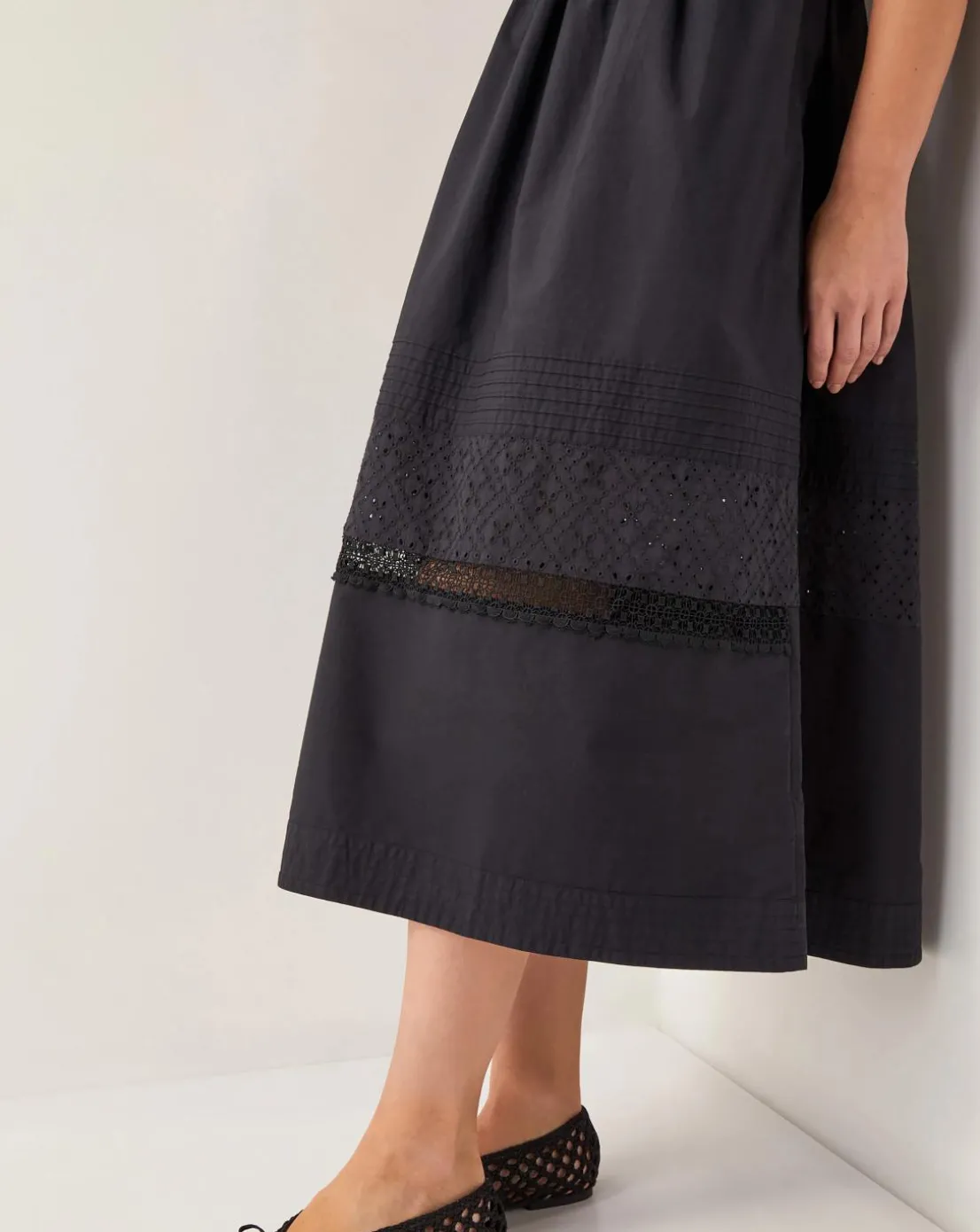 - Totally timeless. Made from breathable cotton fabric, this dress is decorated with intricate broderie detailing and sheer lace-embroidered panels through the puff sleeves, bodice and midi-length hem. Dress up with statement heels or style casually with your favourite flats.