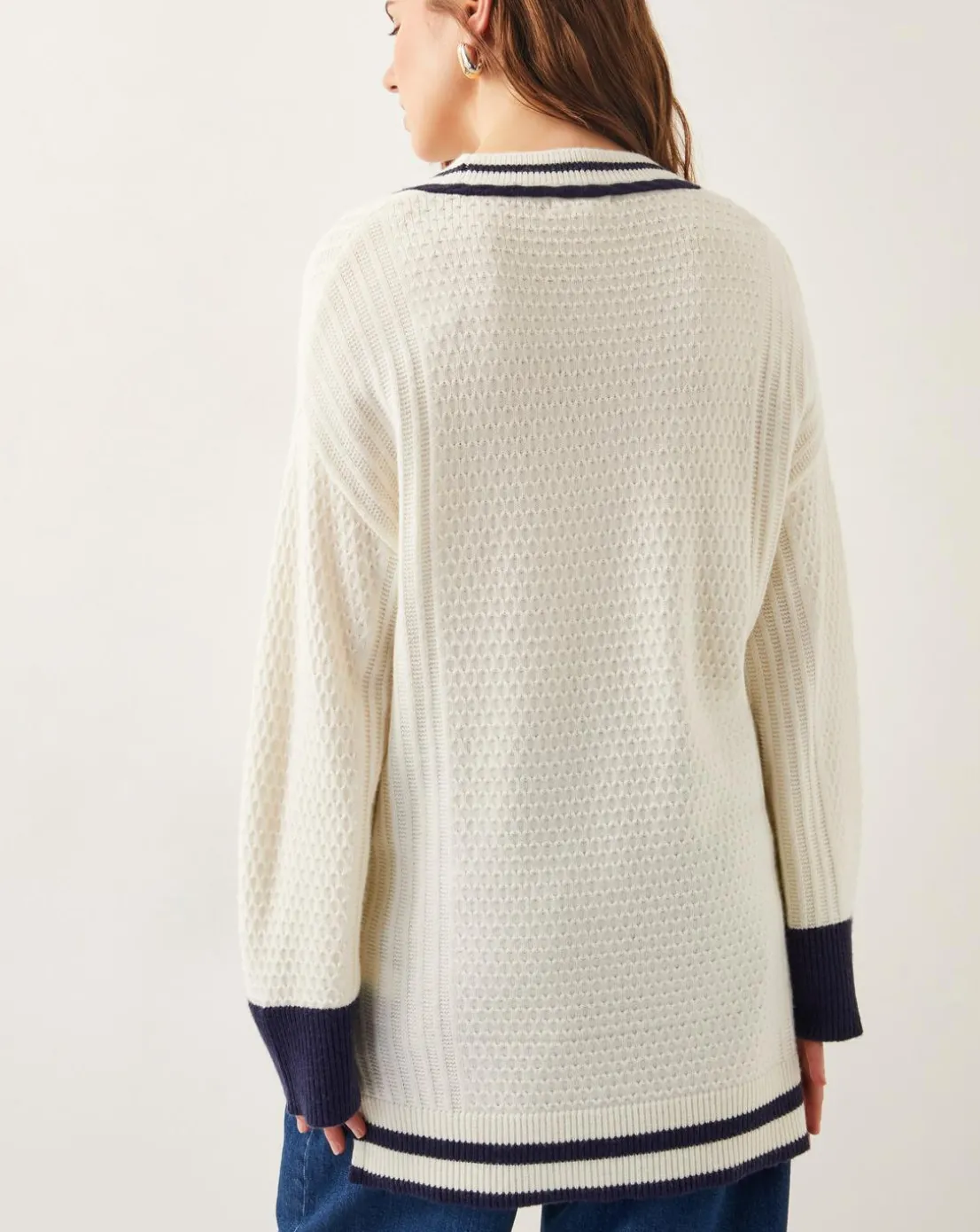 - Slouchy chic. Exuding the preppiness of a cricket sweater, this V-neck style is stitched in a mix of decorative knits with navy blue stripe trim to finish. Equal measures smart and cosy, it’s a real all-rounder.