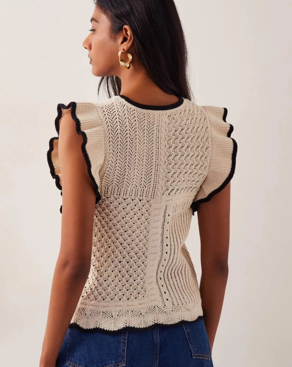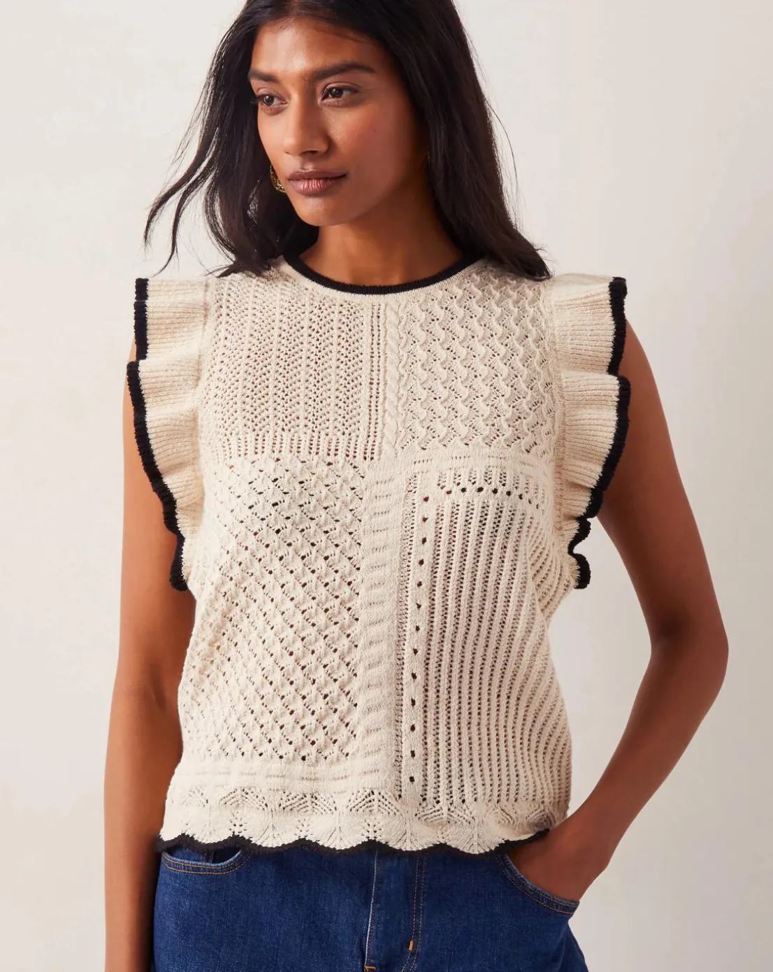 - Frilling. The perfect pick for between seasons styling, this tank top is stitched with a patchwork of decorative knits, frilly shoulders and a contrast scalloped finish.