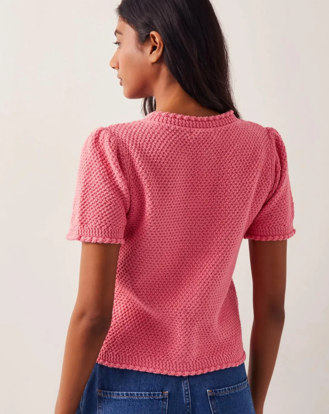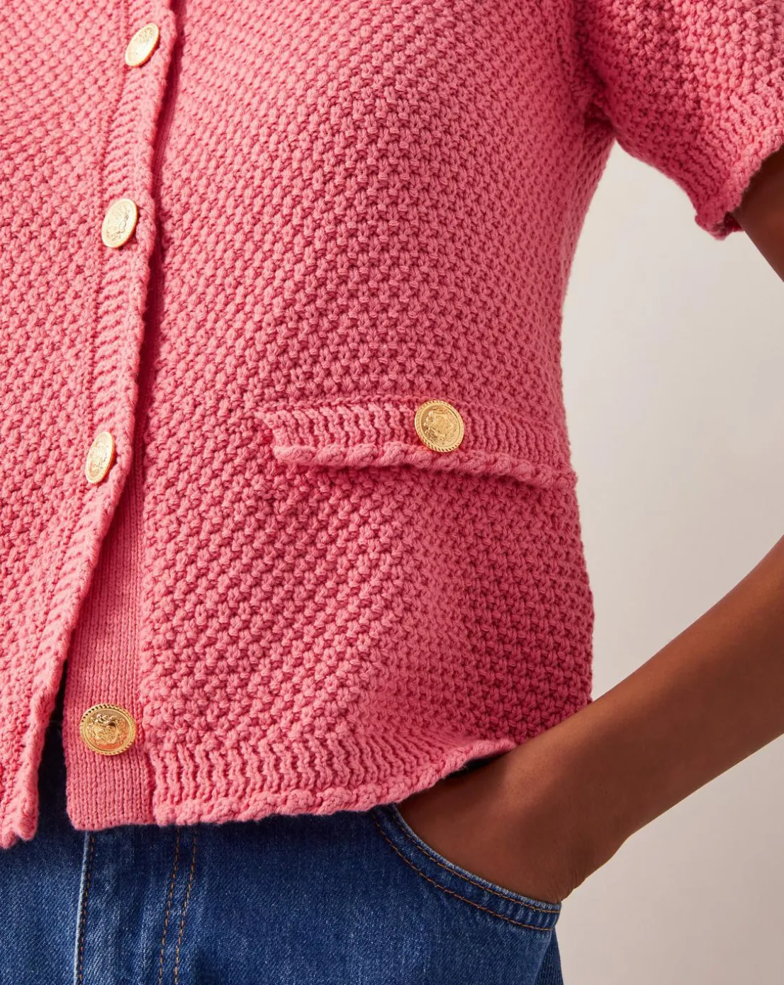 - Pink to make everyone wink. Featuring an all-over textured finish, this cardigan is decorated with vintage-style gold buttons through the front with short sleeves. Jeans, meet your new best friend.