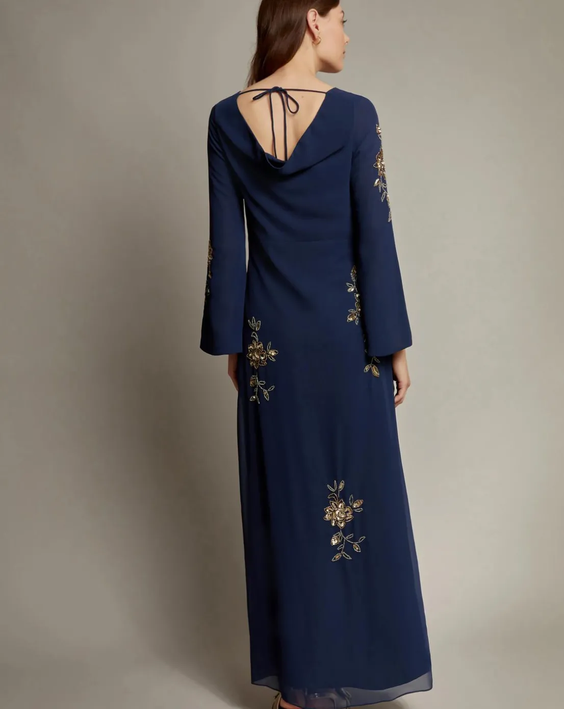 - A style dedicated to those who happily fall under the spell of a pretty detail. Primed for any special occasion in your social calendar, this elegant maxi dress is designed with golden sequin florals and long sleeves with statement flare. Finished with a side split to show off whatever dazzling footwear you pair it with.
