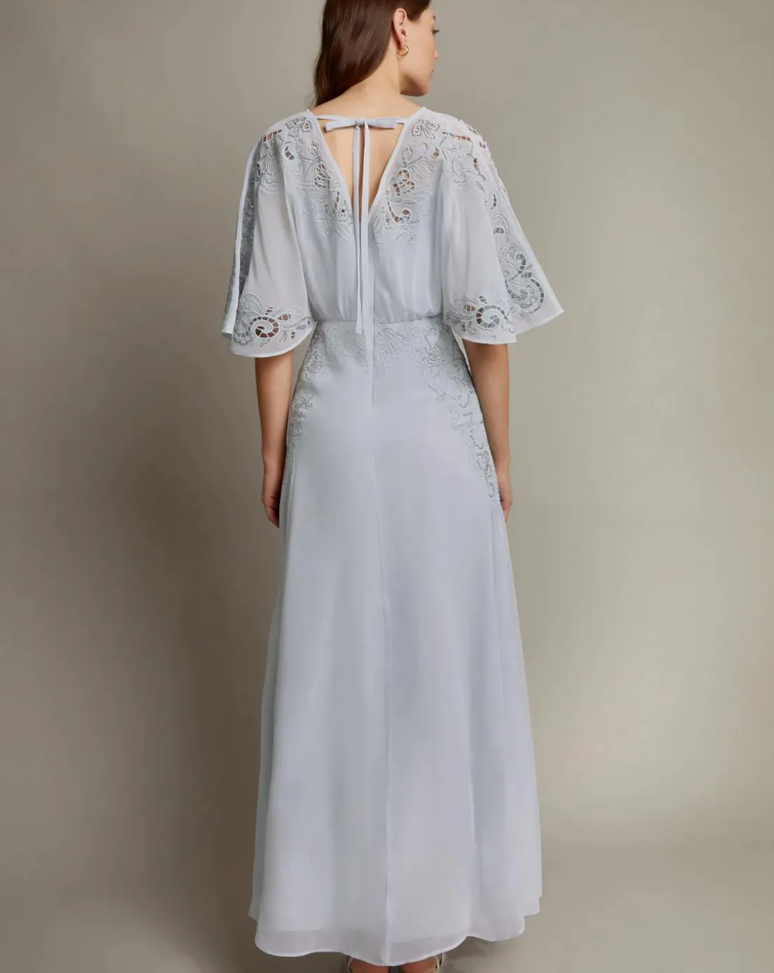 - The perfect dress for ‘I do’s. Framed with floaty angel sleeves and decorated with embellished broderie for a touch of sparkle, this elegant dress falls to an ankle-grazing length. Best paired with silver accessories and strappy heels to match.