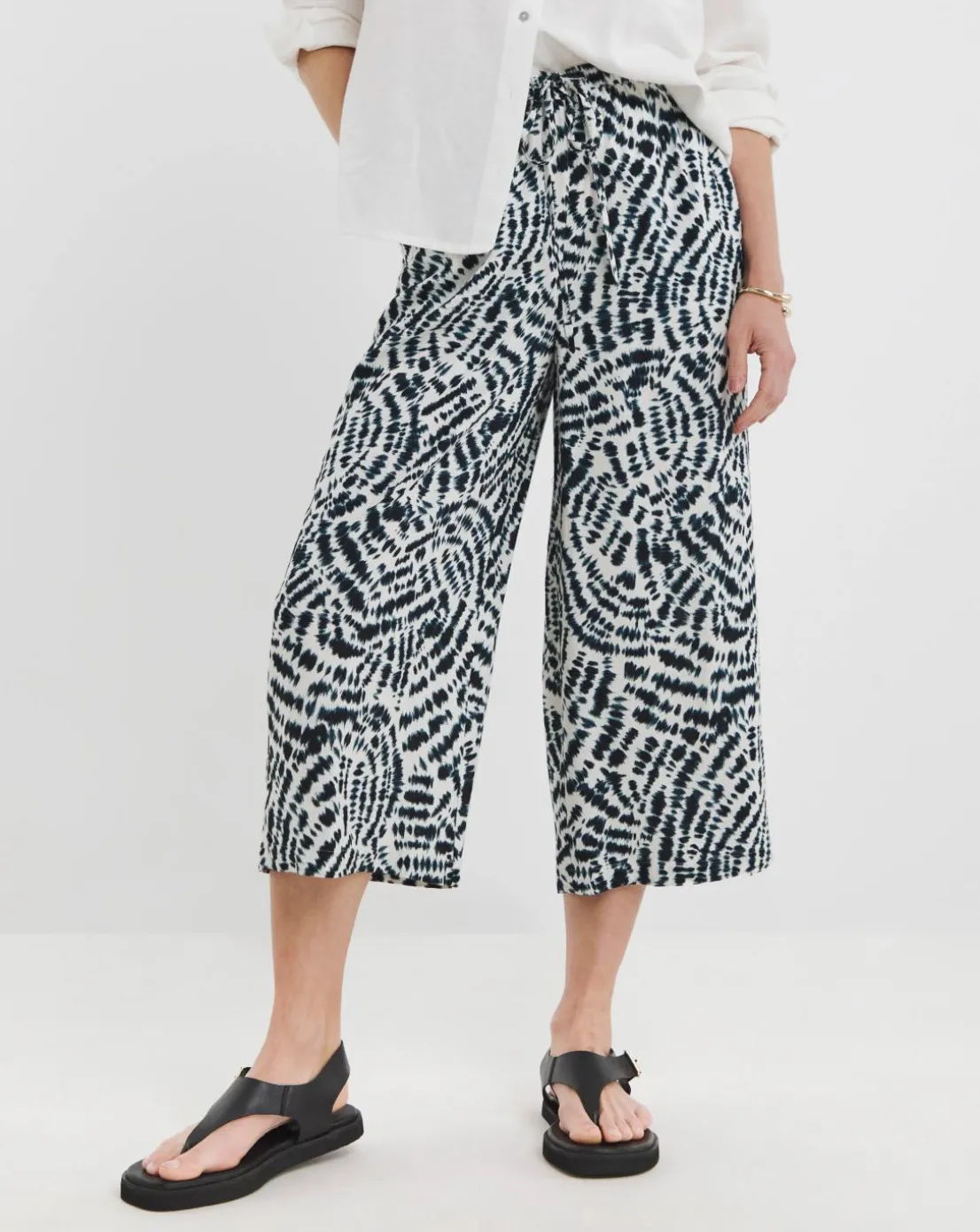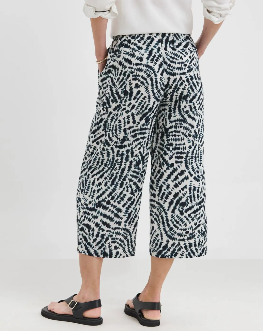 Navy Print Linen Mix Cropped Wide Leg Culottes