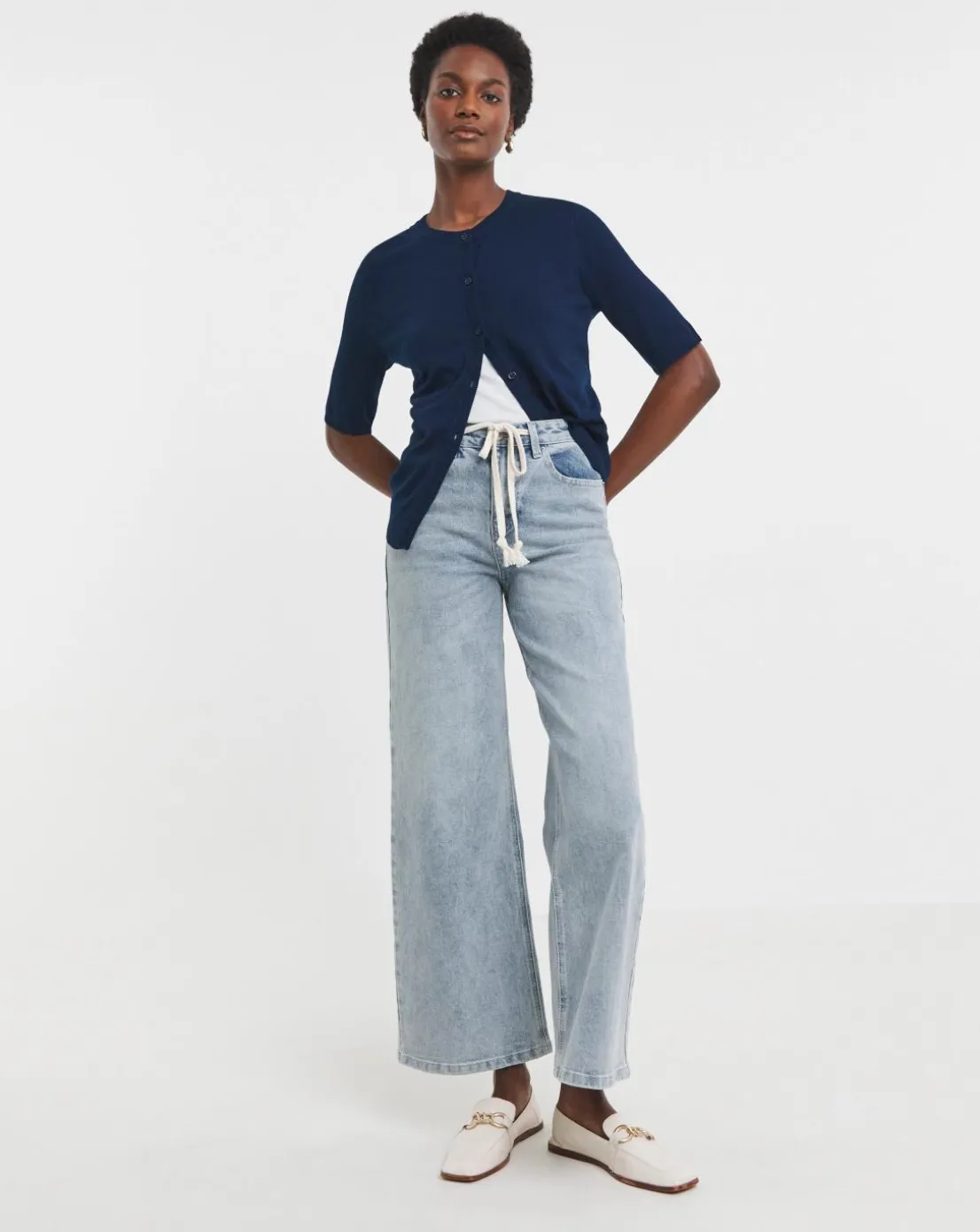 Our crew neck cardigan in navy is the perfect staple for you new season wardrobe. With so many ways to be paired, the stylying opportunitues are endless!