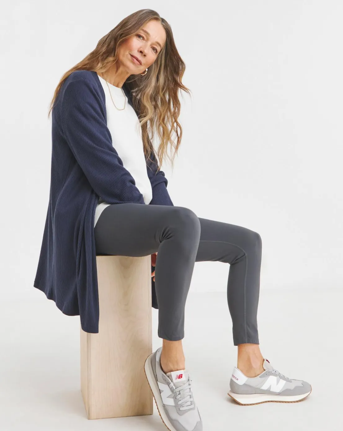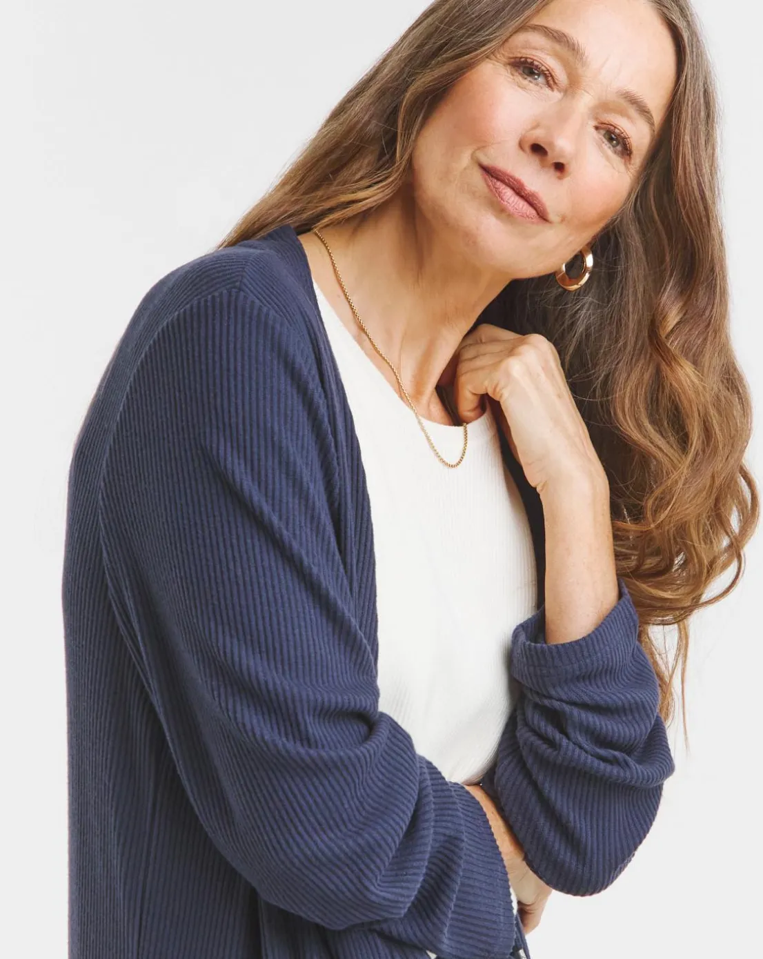 This navy longline cardigan is a super easy layering piece. In a soft jersey fabric with pockets, it’s a comfortable and practical cardi.