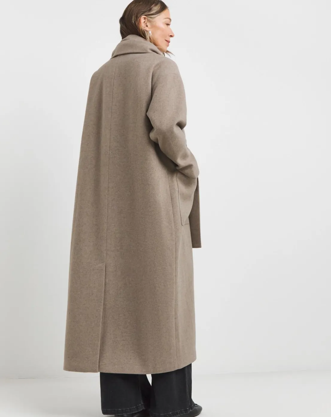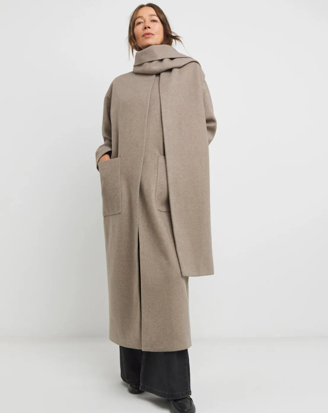 Feel stylish and sophisticated in our new longline scarf coat. Featuring a soft to touch wool like fabric, a detachable scarf and front pockets. Also available in navy.