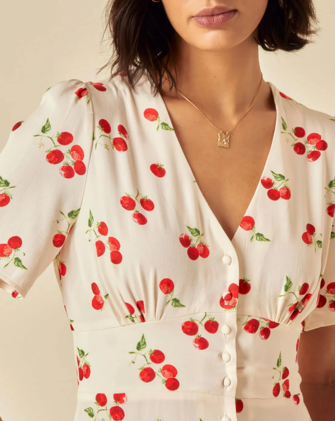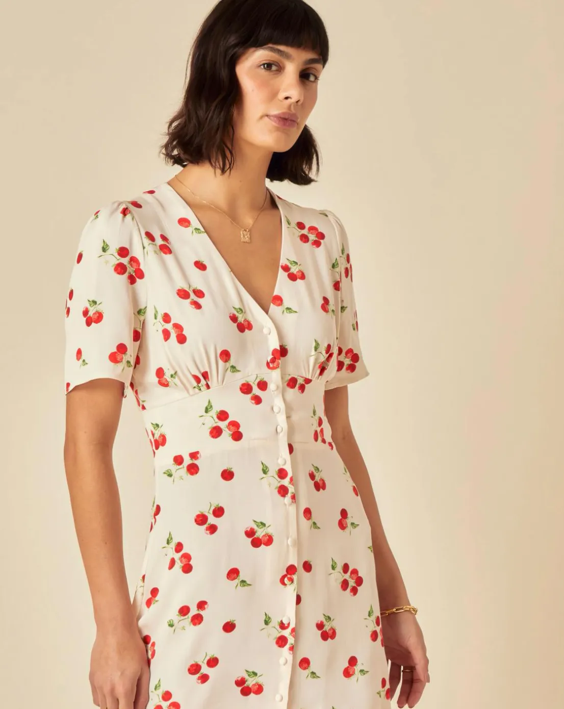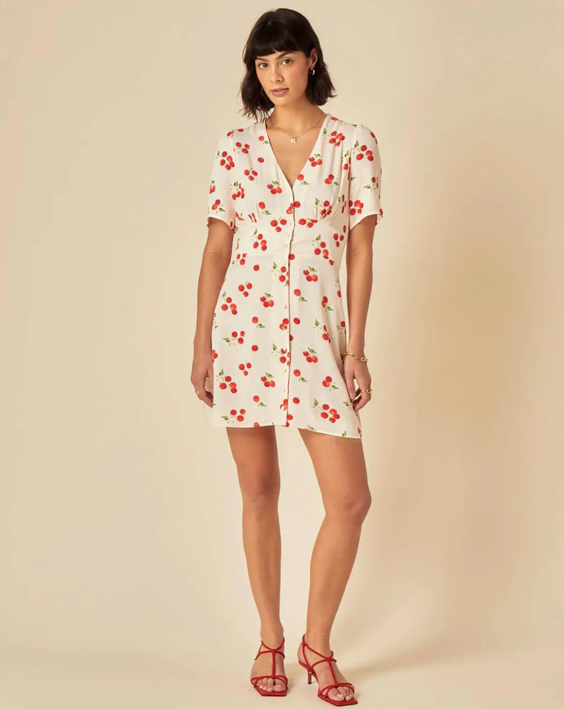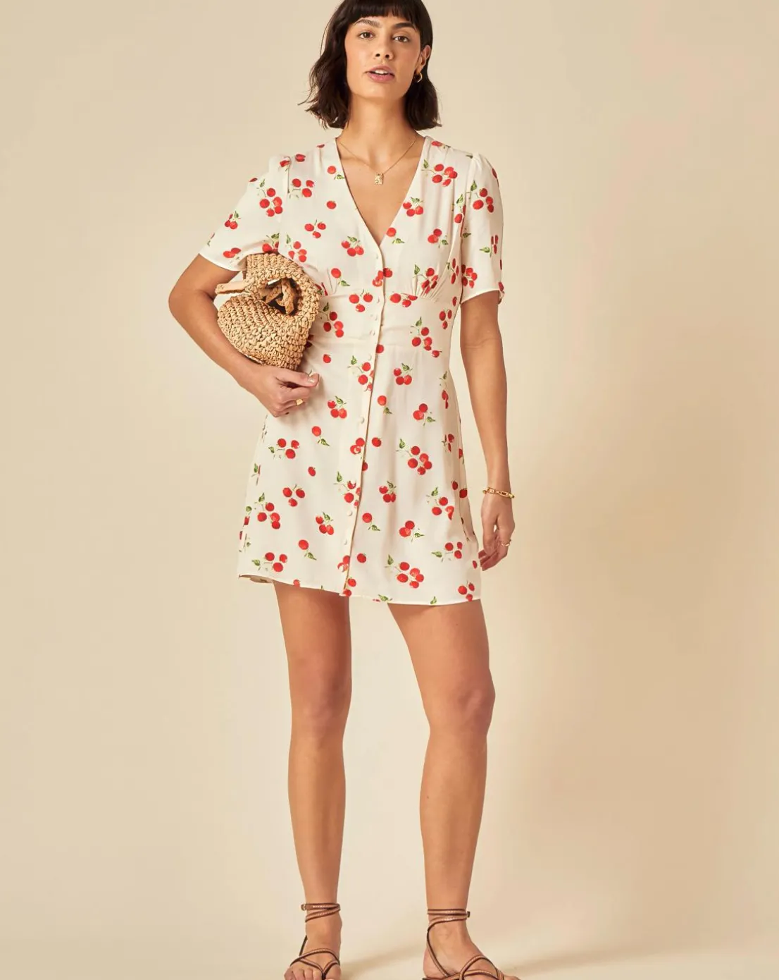 The cherry on top. Coming in white with a summer-ready cherry print, we love the V-neckline and button front detailing on our mini dress. Style with barely-there sandals.