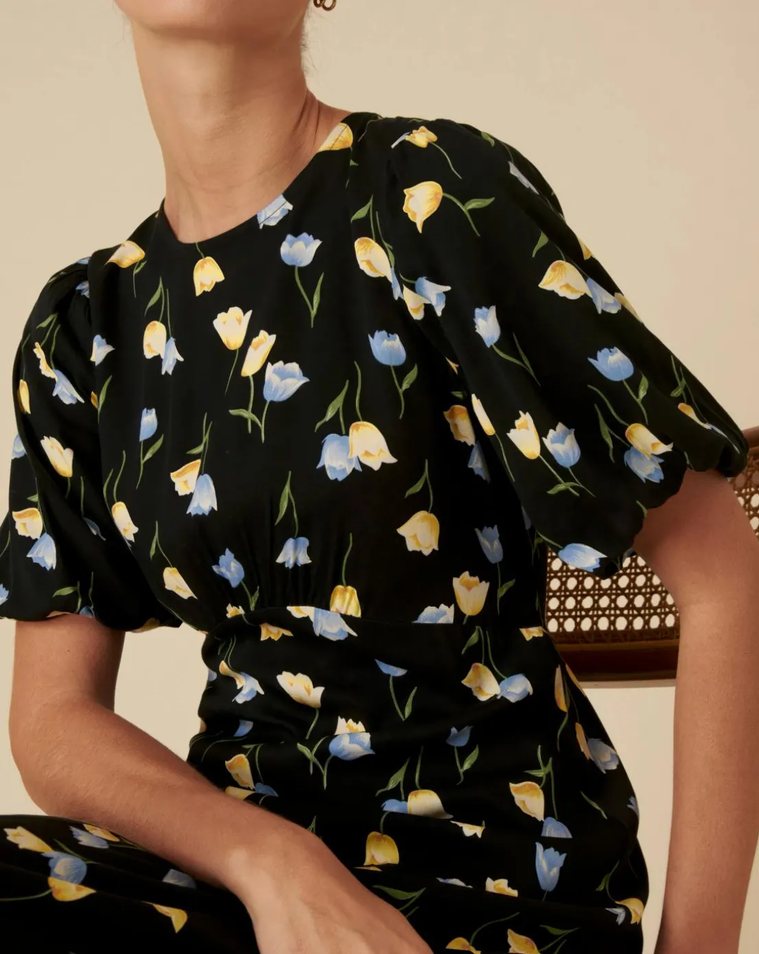 Dress her up or dial her down. This black ditsy floral dress will take you from day to evening in an instant. We love her puff sleeves and swishy skirt. Style yours with black knee high boots and throw over a black cardigan.