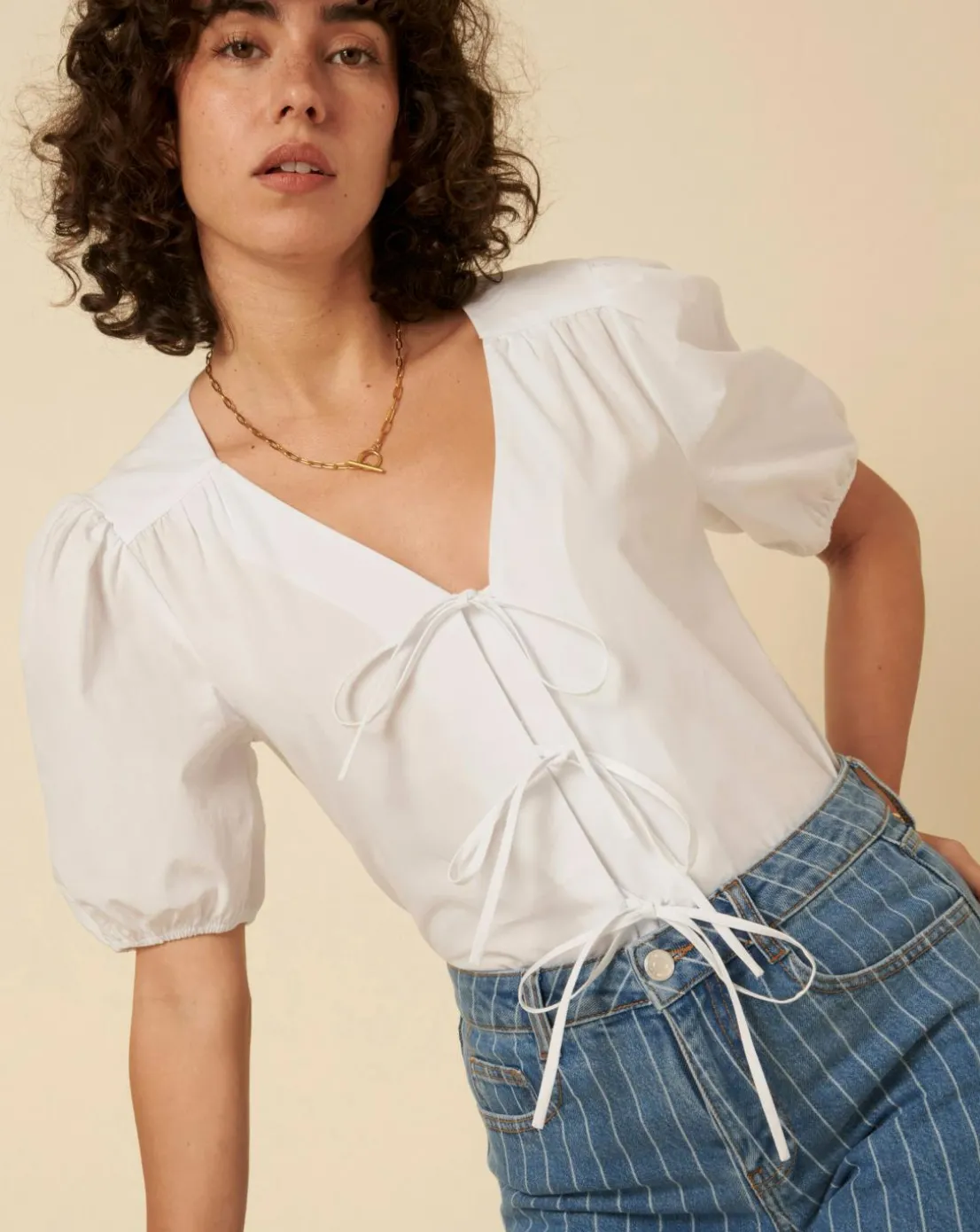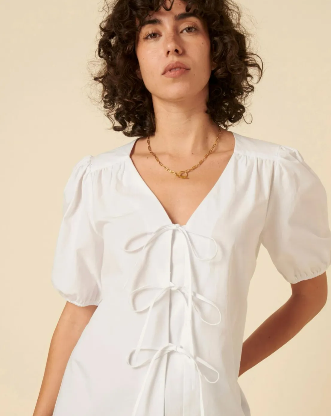 Our sell-out Bernadetta blouse is back with short sleeves for summer. This white shirt comes in a stylish boxy fit with mid-length puff sleeves. For that classic so-now look, shes also finished with a trio of string ties that line the front. Elevate yours with gold jewellery.