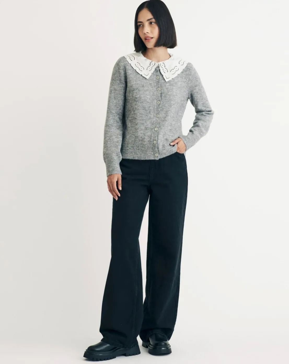 Put some prep in your step. Expertly crafted from a blend of recycled materials, this grey cardigan proves that it’s all in the details. We love the so-now collar and ribbed trims. Plus it will go with absolutely everything in your fall wardrobe. We’re elevating ours with gold jewellery.