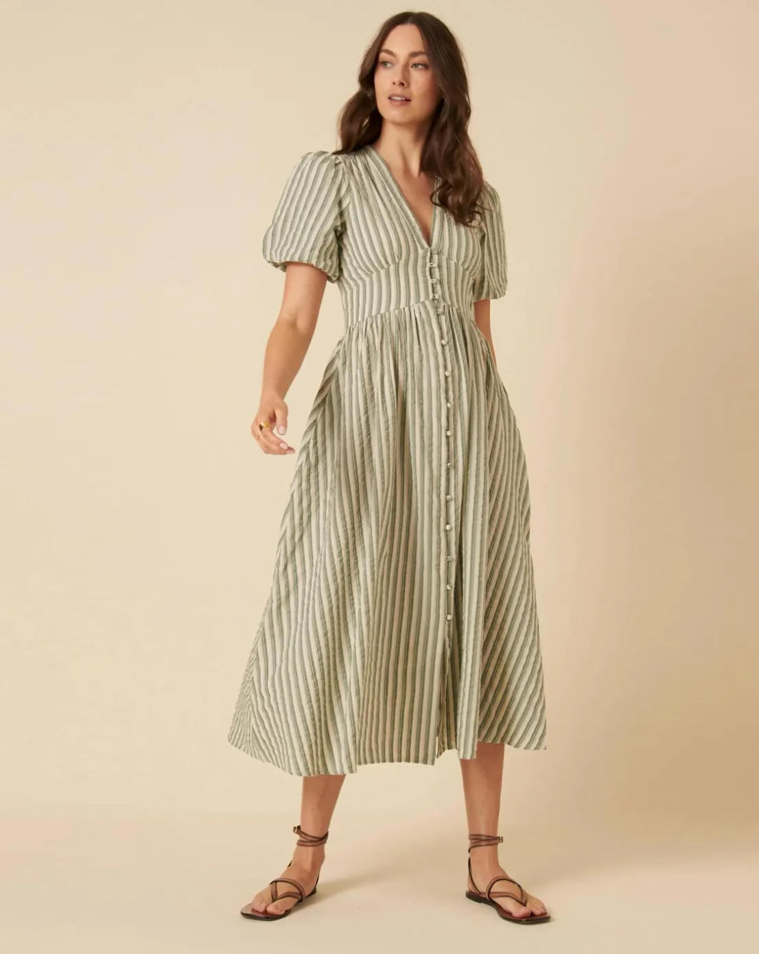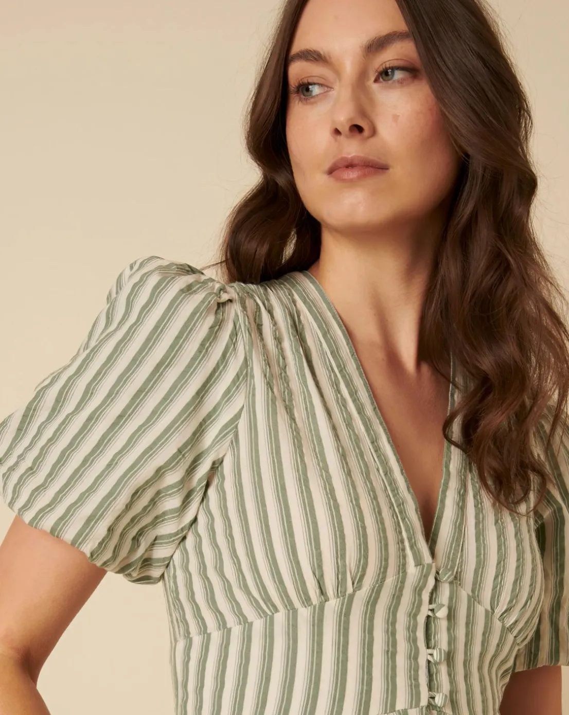 A new take on our stellar style, Starlight. In green stripes, she will take you from day to night in an instant. We are obsessed with her soft gathering, short balloon sleeves and pretty line of covered buttons, shes even got pockets. Style yours with heeled boots.