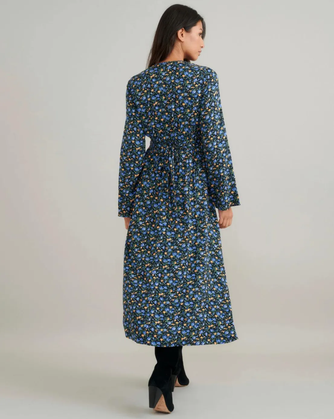 Dress her up or dial her down. Our Lydia blue and yellow floral print dress will take you from day to night in an instant. We love her slightly flared long sleeves and swishy skirt. Style yours with boots or barely-there heels.