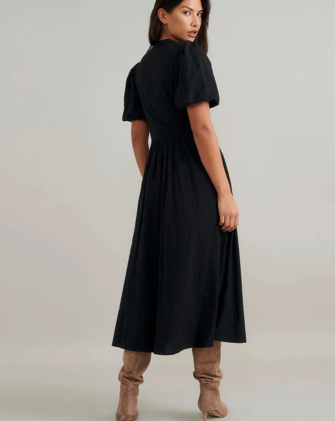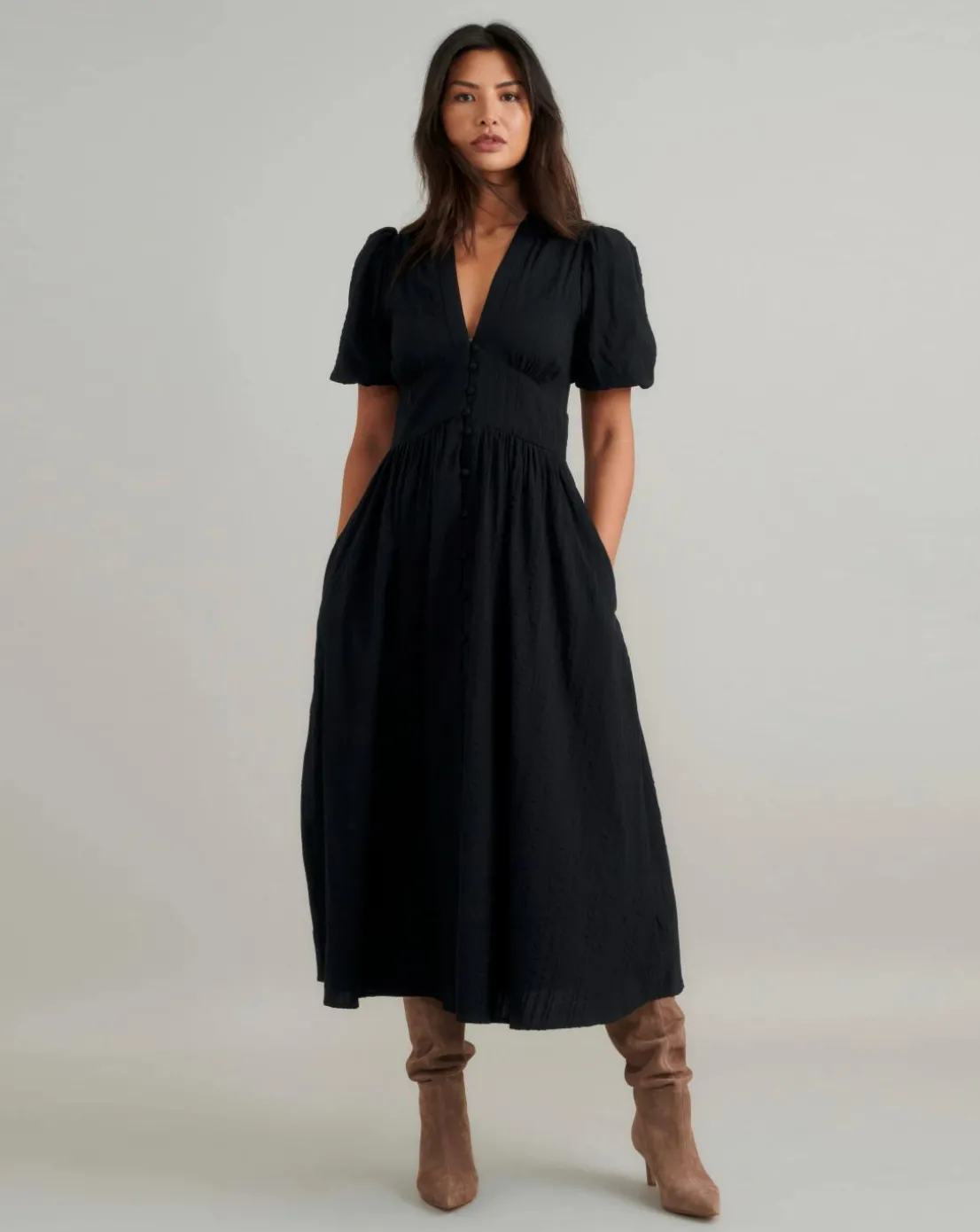 A spring-ready take on our stellar style, Starlight. Coming in classic black, were obsessed with her soft gathering, puff sleeves and pretty line of covered buttons, shes even got pockets. Style yours with everything you already own.
