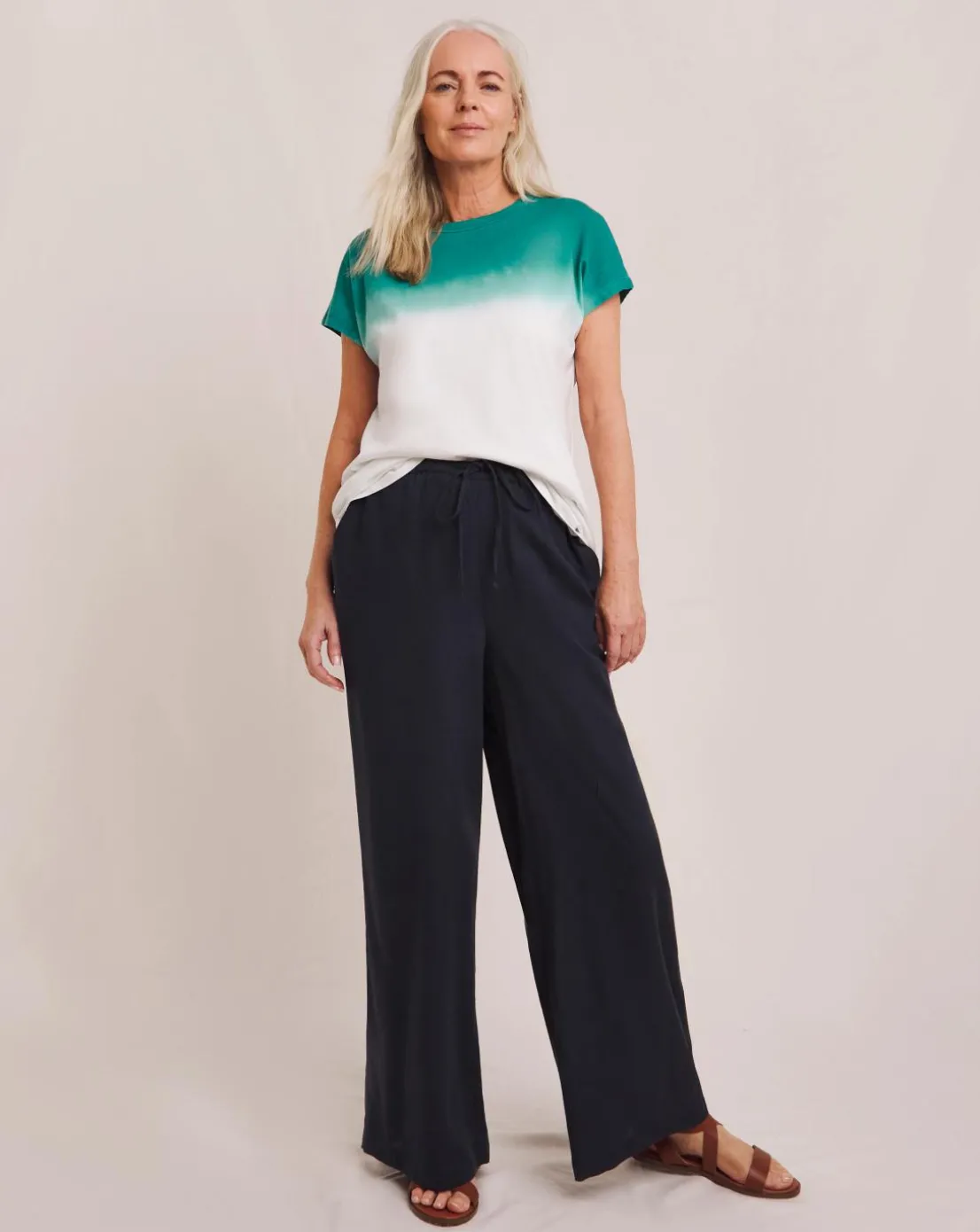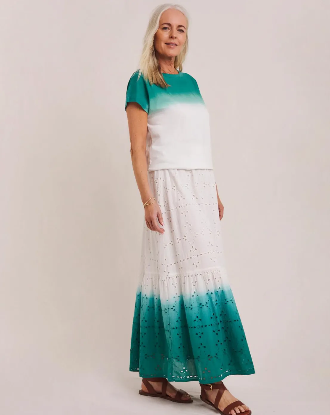 This t-shirt should be in everybody’s summer wardrobe. Featuring gorgeous ombre design, trun up sleeves, regular fit, soft cotton fabric. Pair with the ombre broderie skirt or style with linen trousers.