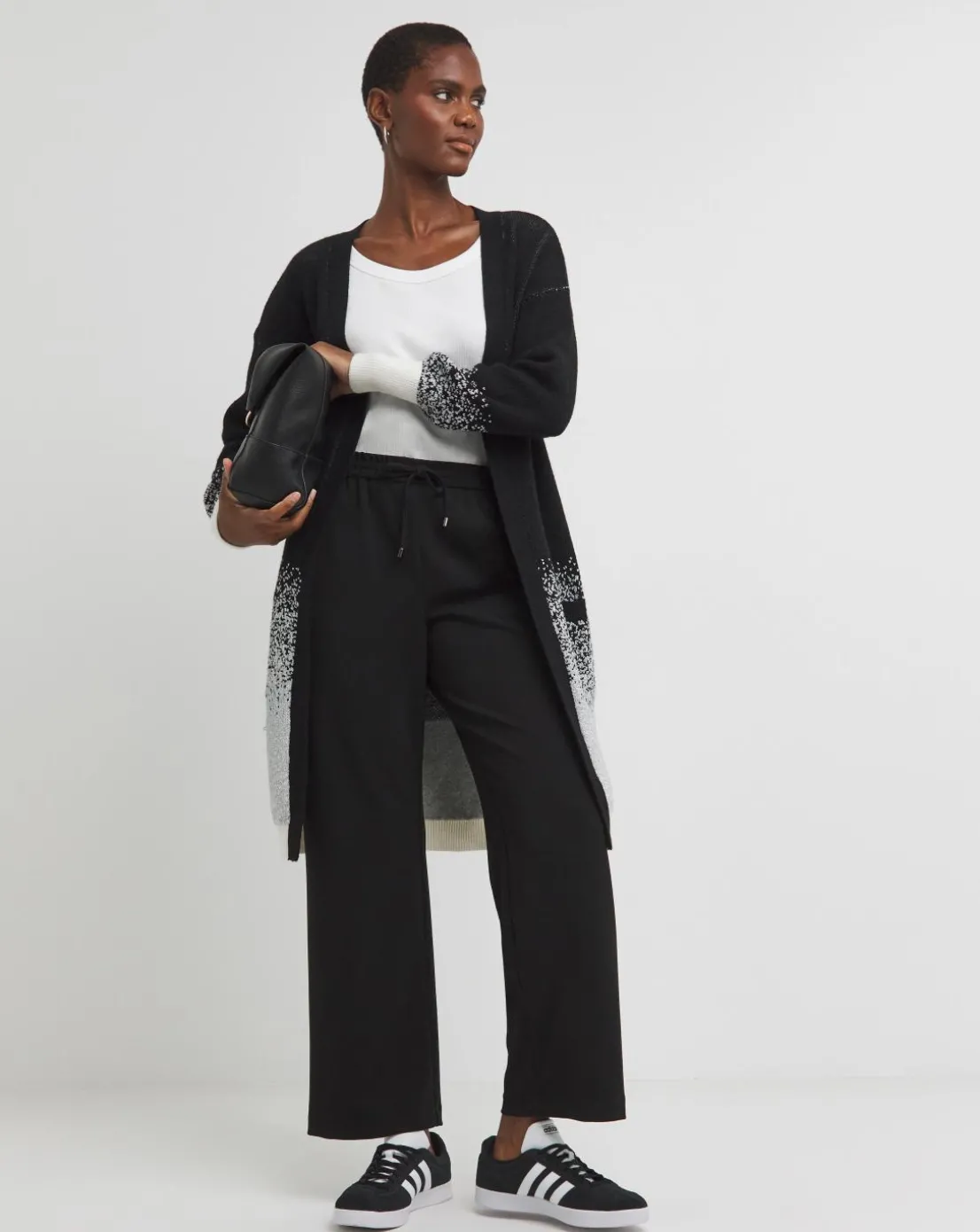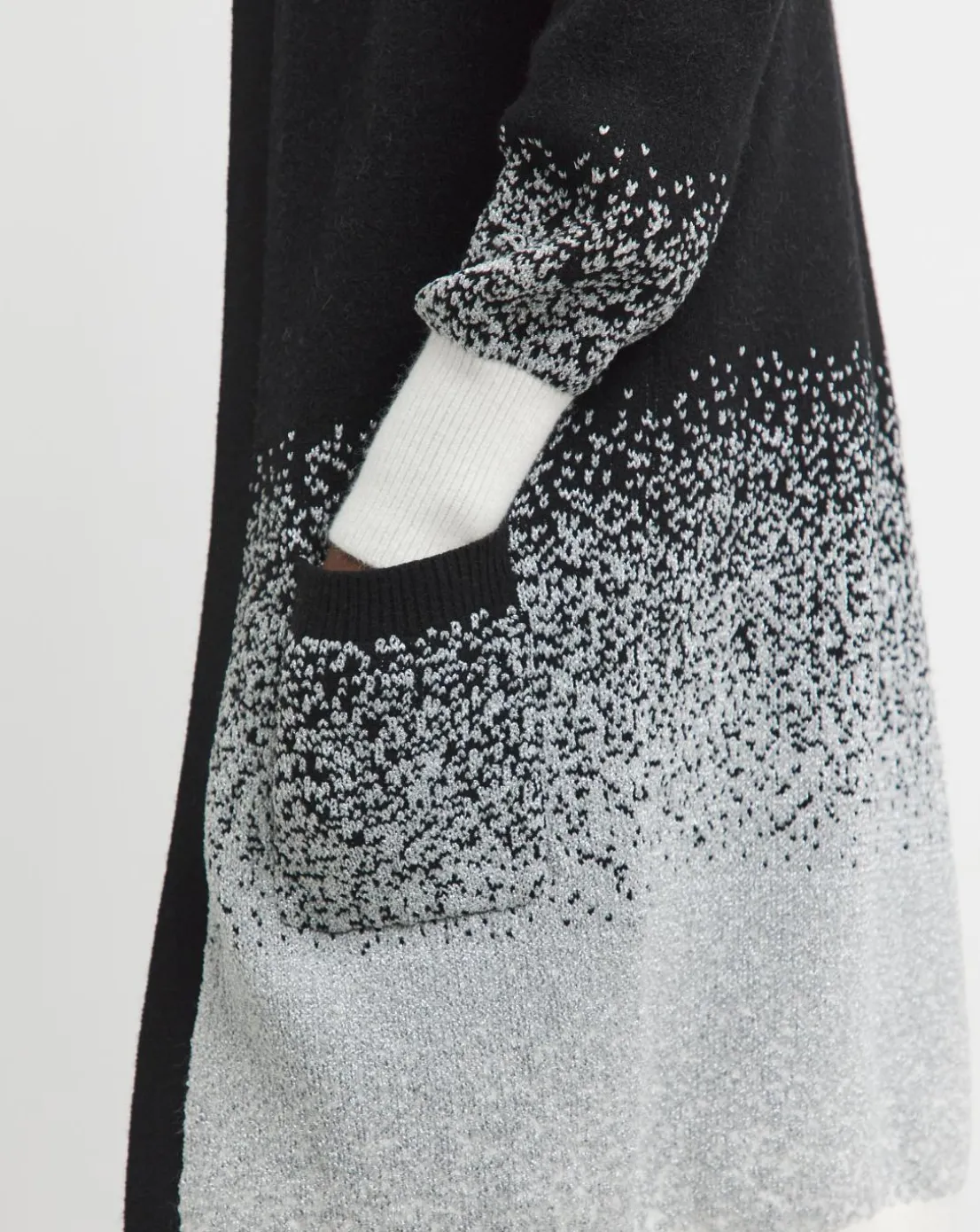 This longline cardigan features an edge to edge design, ombre sparkle detail, long sleeves and a relaxed fit.