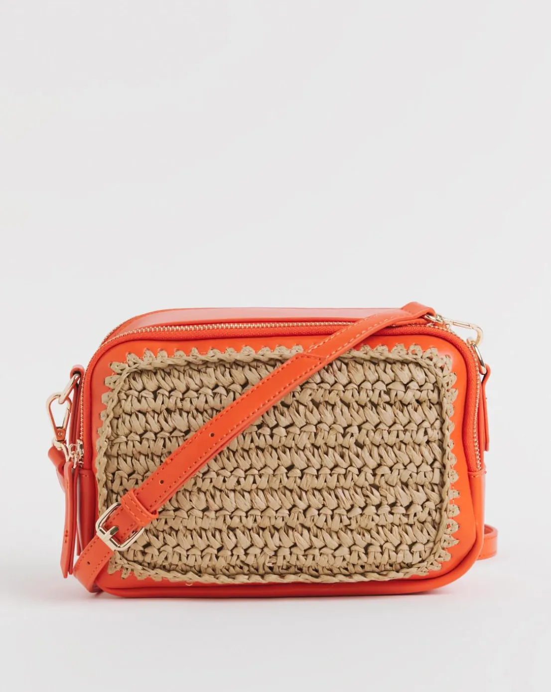 Elevate your spring & summer looks with our orange detail raffia camera bag! Complete with an intricte raffia panelling detail on the front & back of the bag for added texture & interest – perfect for those summer days and evenings! This bag also comes with a secure double zip closure and an adjustable crossbody strap for ease.