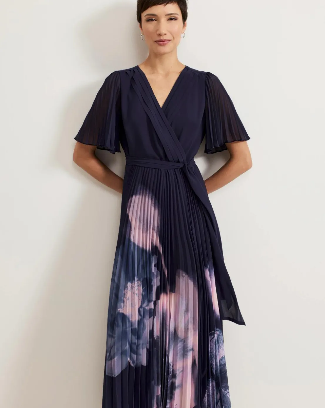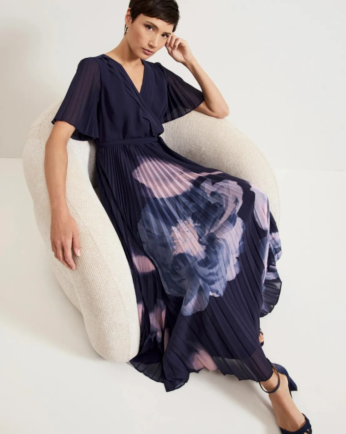 Step-up your occasionwear with our Abigail dress. With an understated yet elegant floral print our dress features a feminine V-neckline and faux-wrap bodice. Delicate pleating on the sleeves and skirt add movement to the flowing silhouette. We style ours with matching navy accessories for a timeless event look.