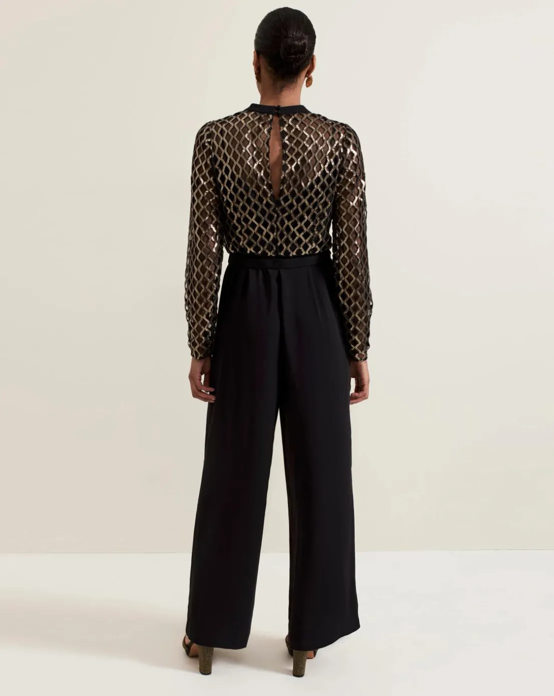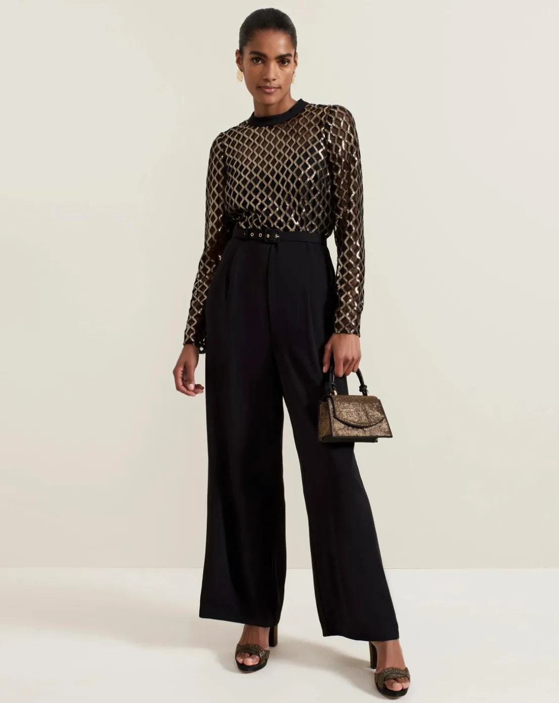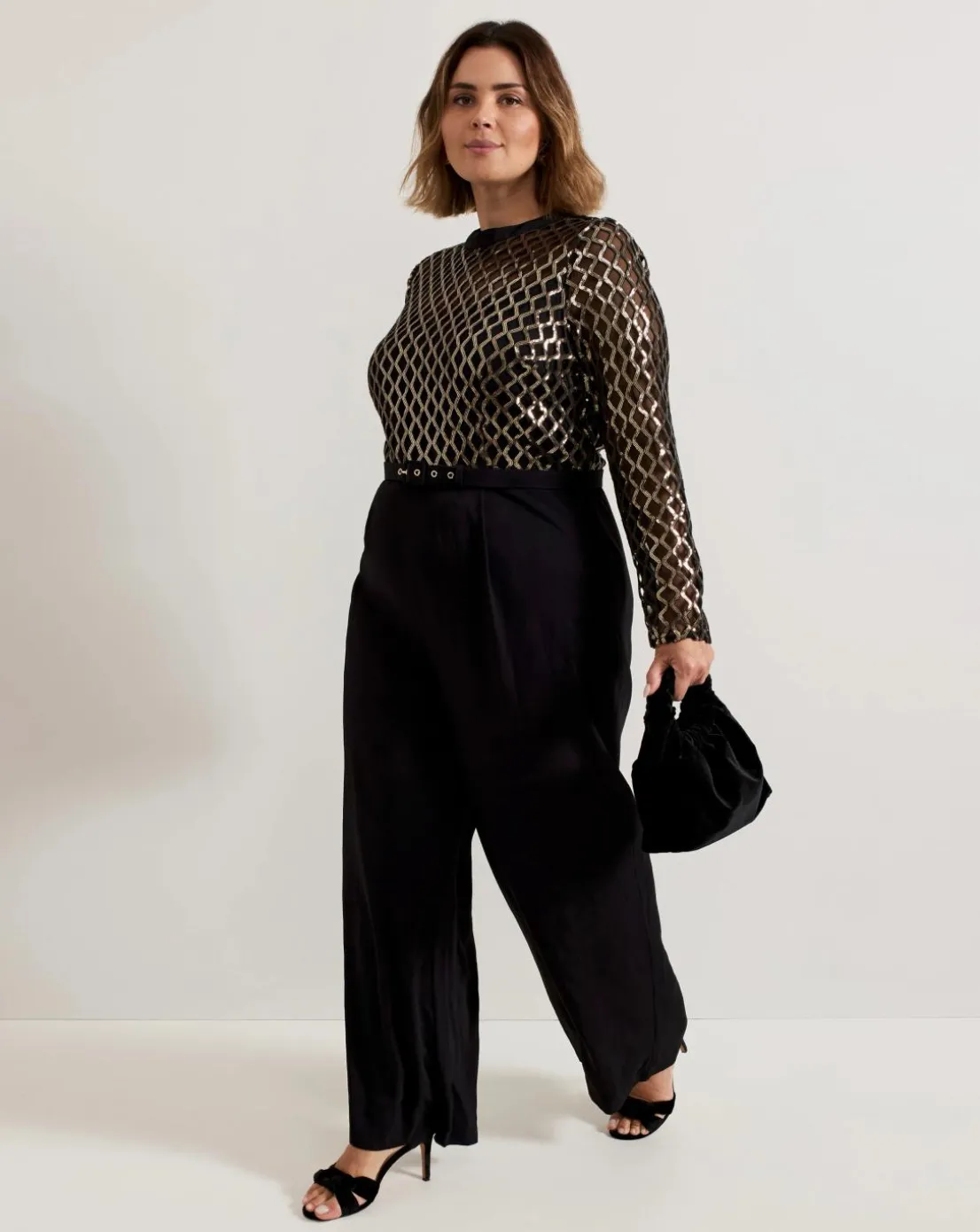 Meet your new favourite occasion jumpsuit. Designed with a black mesh top featuring a gold diamond print design our jumpsuit falls to a wide-leg black trouser. Considered details such as the matching black belt to highlight the waist and keyhole detail at the back elevate the style to create a sophisticated look for your next big event.This style is responsibly sourced. This style has been made from recycled polyester, giving materials that would have ended up in landfill a new lease of life.
